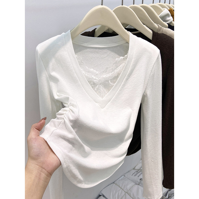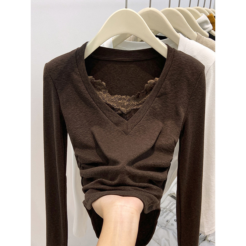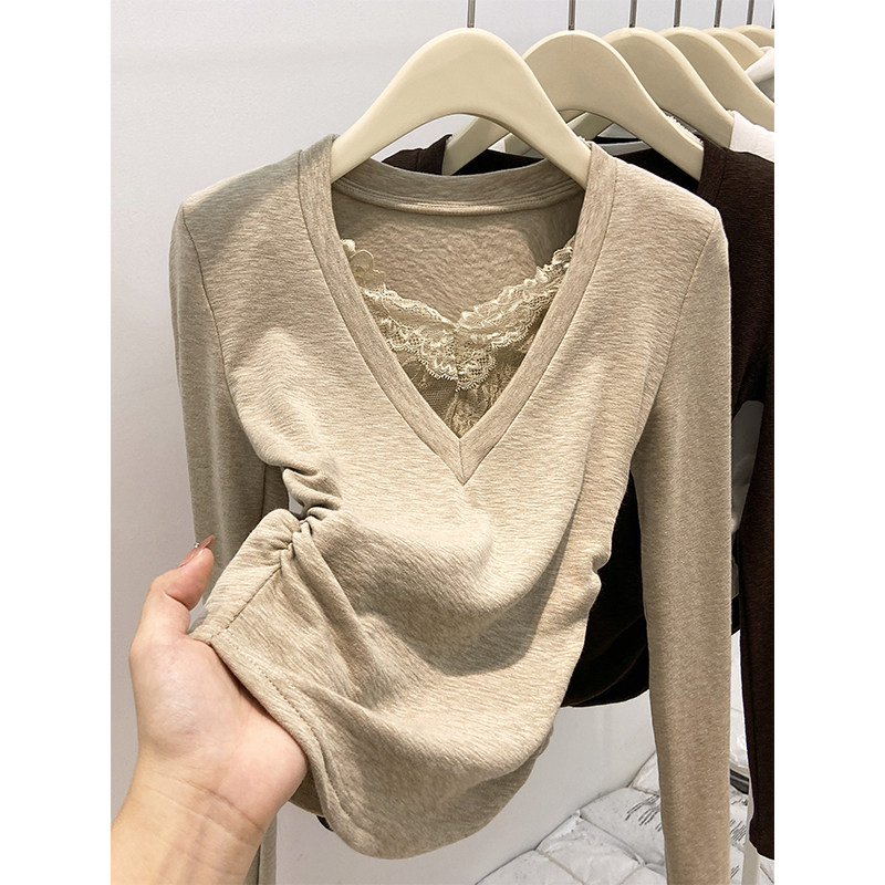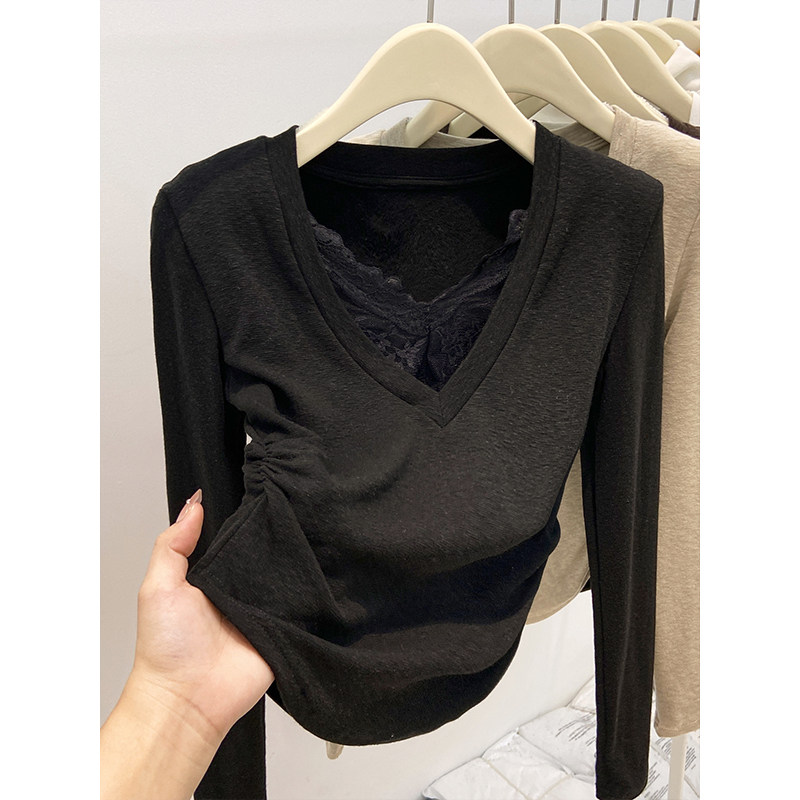 辣妹蕾丝拼接V领长袖磨毛t恤女秋冬新款褶皱收腰显瘦短款打底上衣