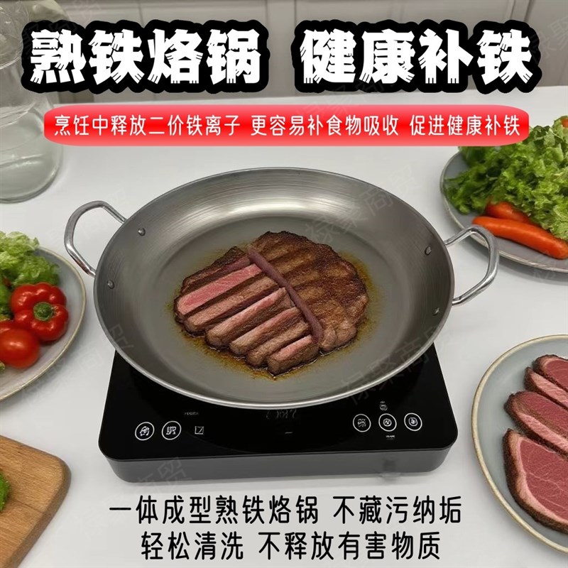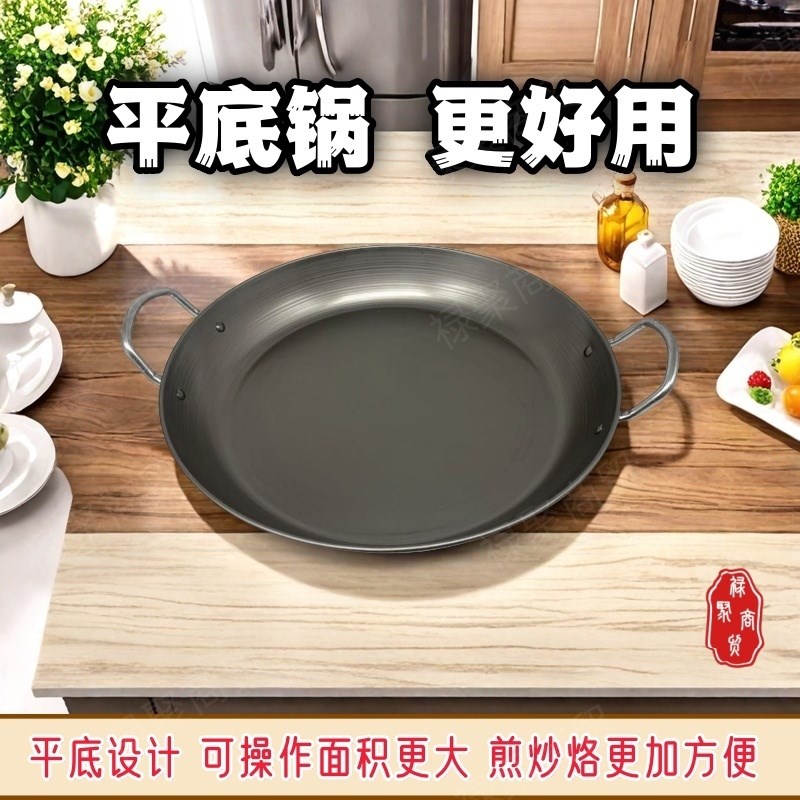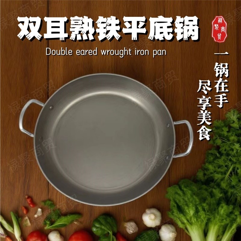 老式熟铁双耳平底锅商用家用健康无涂层平底铁锅煎炸锅烙锅炸串锅