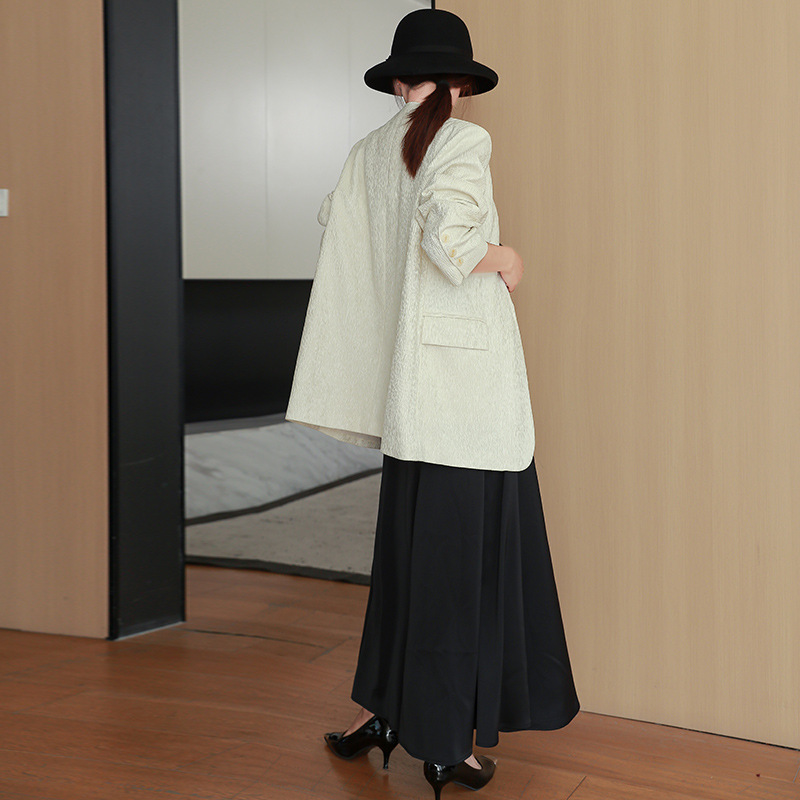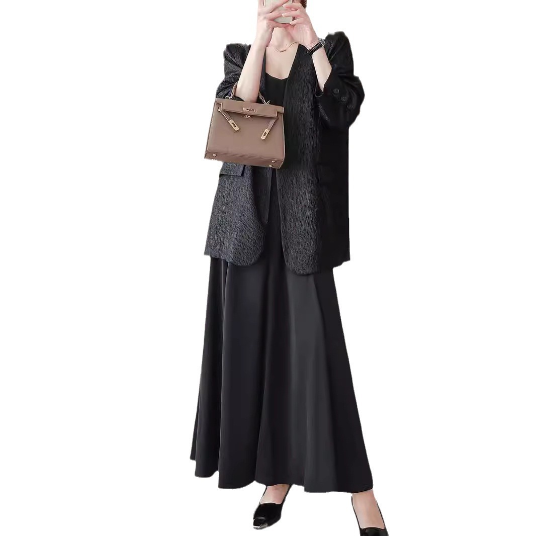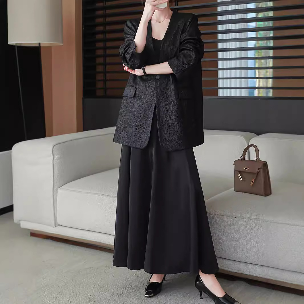 2025春秋新款大码女装黑色V领长袖褶皱西装外套a字吊带长裙两件套