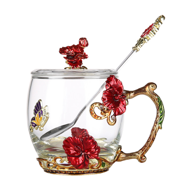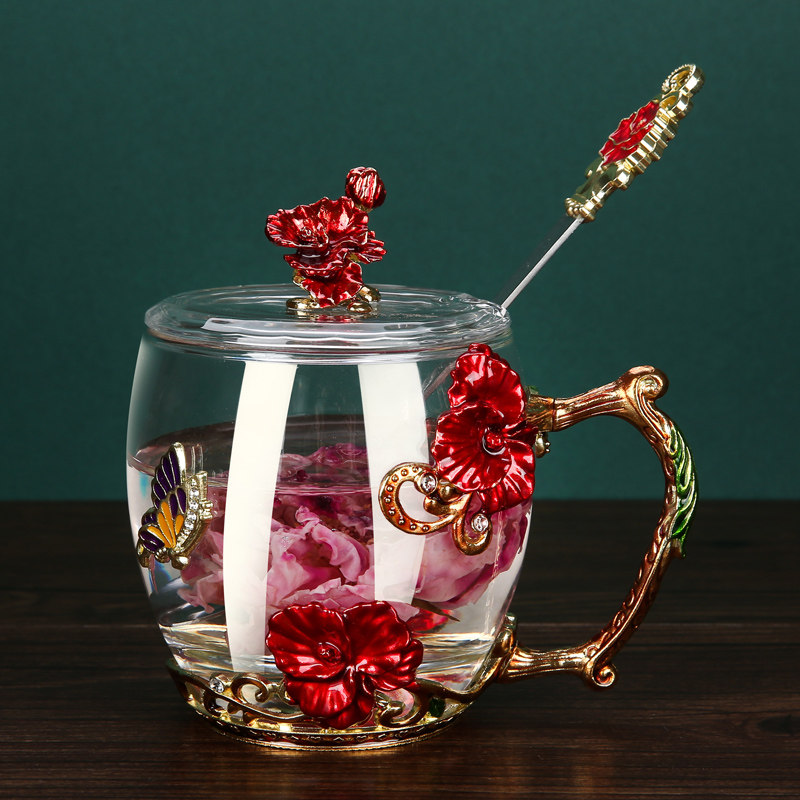 珐琅彩水杯家用玻璃咖啡杯可爱女夏花茶早餐 杯茶杯杯子带盖套装