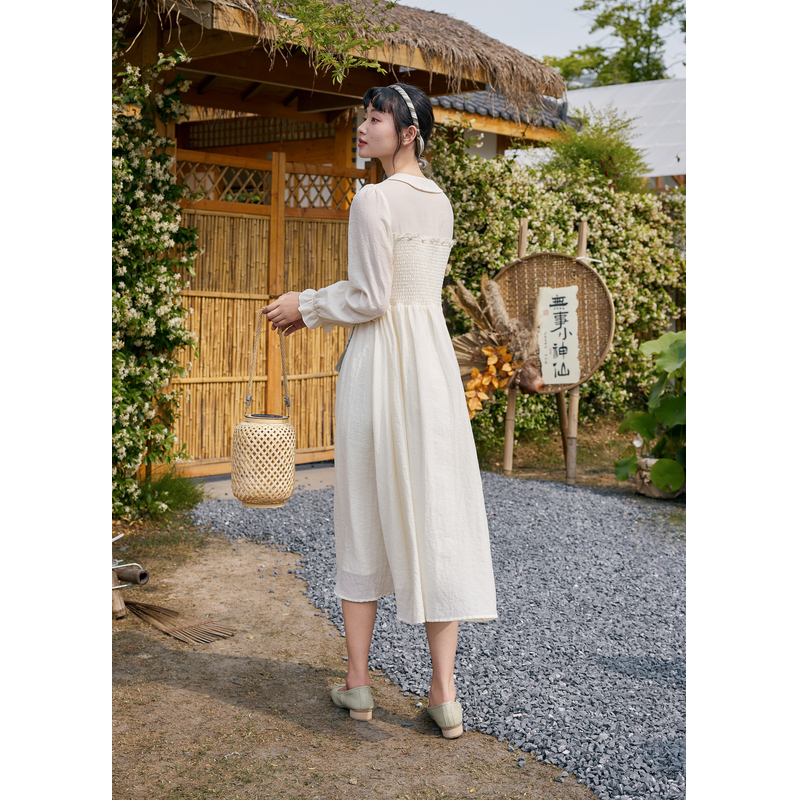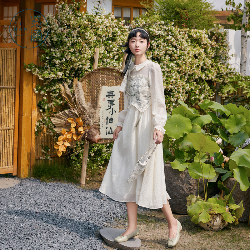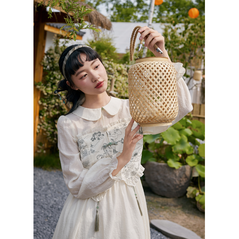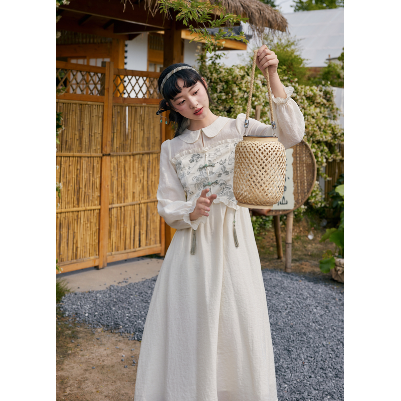 紫涵新中式刺绣连衣裙女秋季新款休闲轻国风翻领荷叶边长袖中长裙