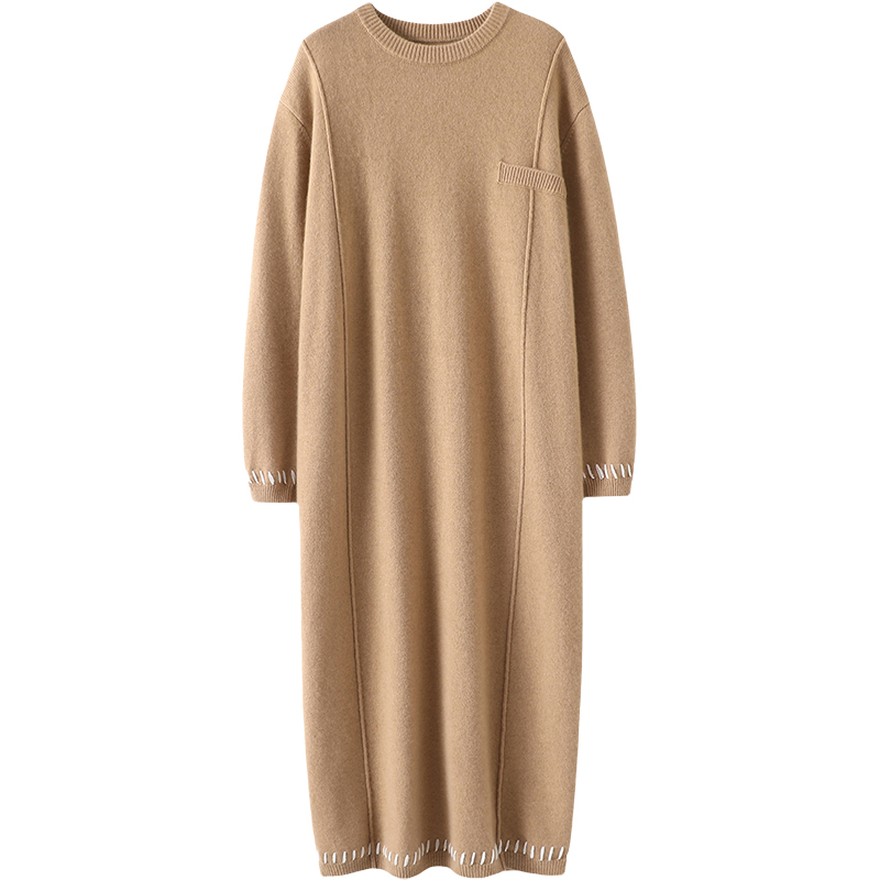 纸片人穿搭!加厚大克重圆领100%山羊绒衫女长款纯羊绒连衣裙子冬