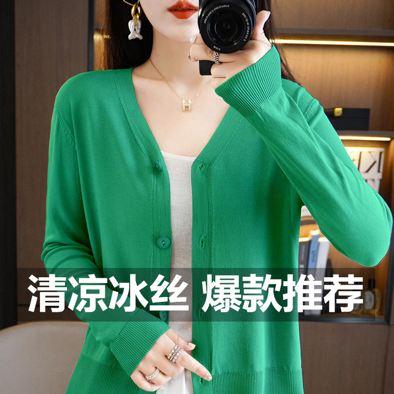 不起球冰丝针织开衫女长袖外搭毛线短款空调上衣夏季新款防晒外套