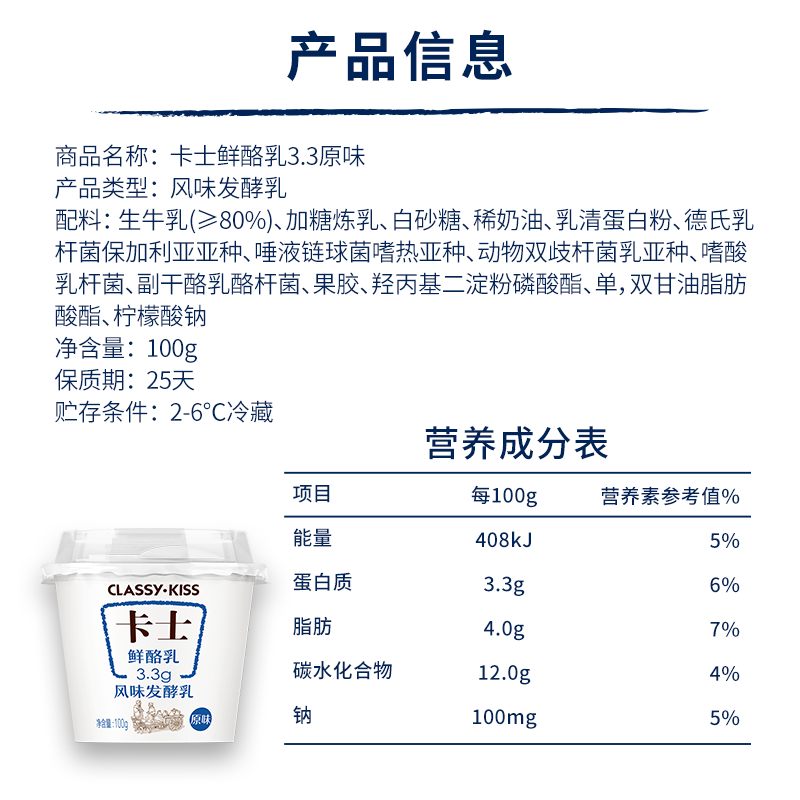 【下拉领淘金币更优惠】卡士酸奶原味鲜酪乳3.3g乳蛋白100g*24杯