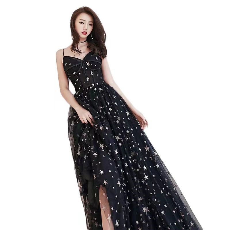 黑色星星吊带晚礼服2024春季新款性感气质生日聚会长款礼服连衣裙