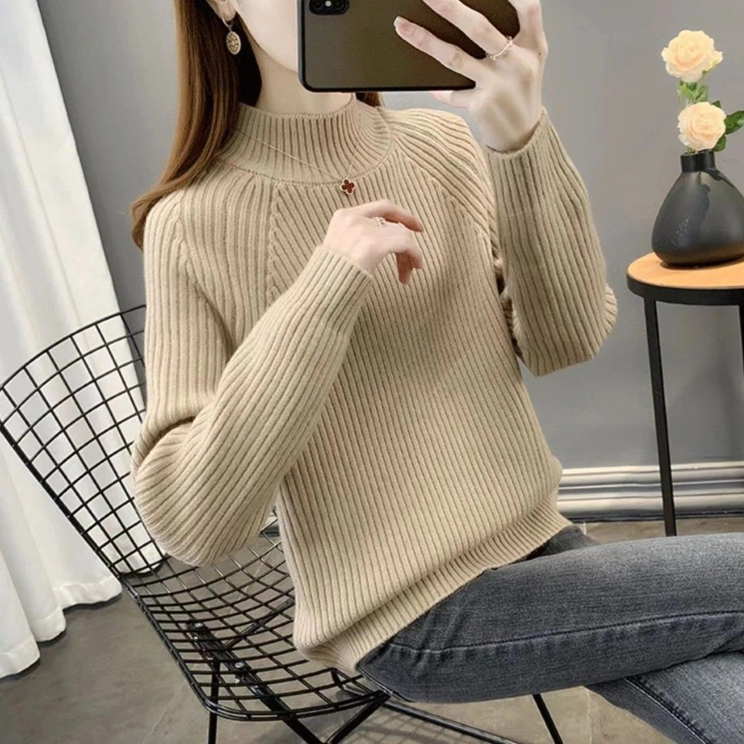 半高领毛衣女秋冬纯色竖条针织衫女时尚简约慵懒风打底羊毛衫上衣