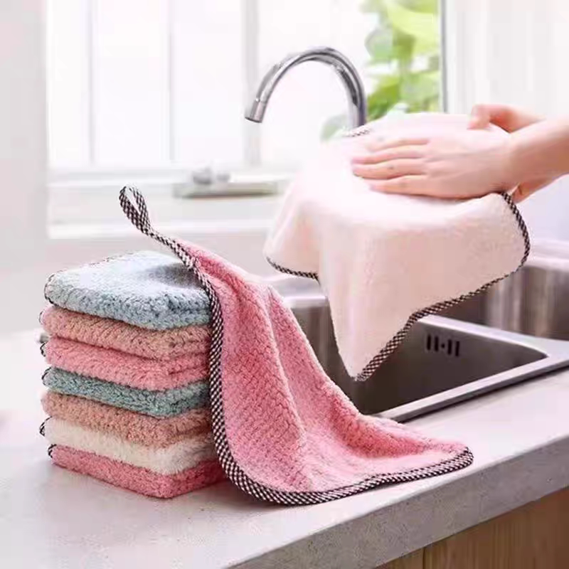 可挂式珊瑚绒双面抹布厨房菠萝格不掉毛吸水擦手巾素色洗碗布