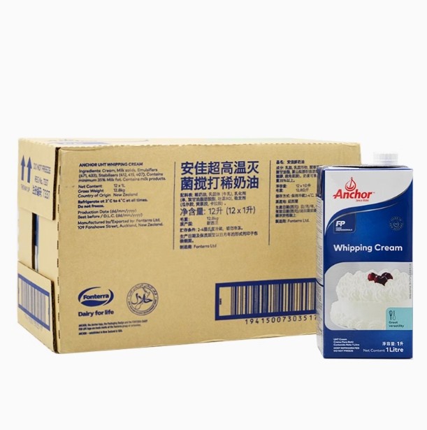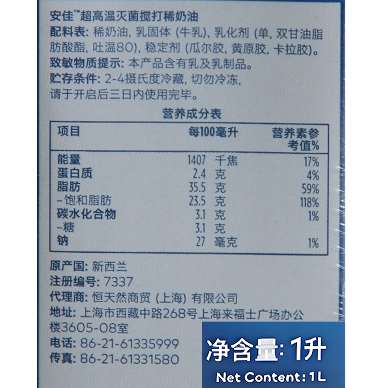 安佳淡奶油1L进口动物性淡奶油瑞士卷生日蛋糕烘焙家用原料稀奶油