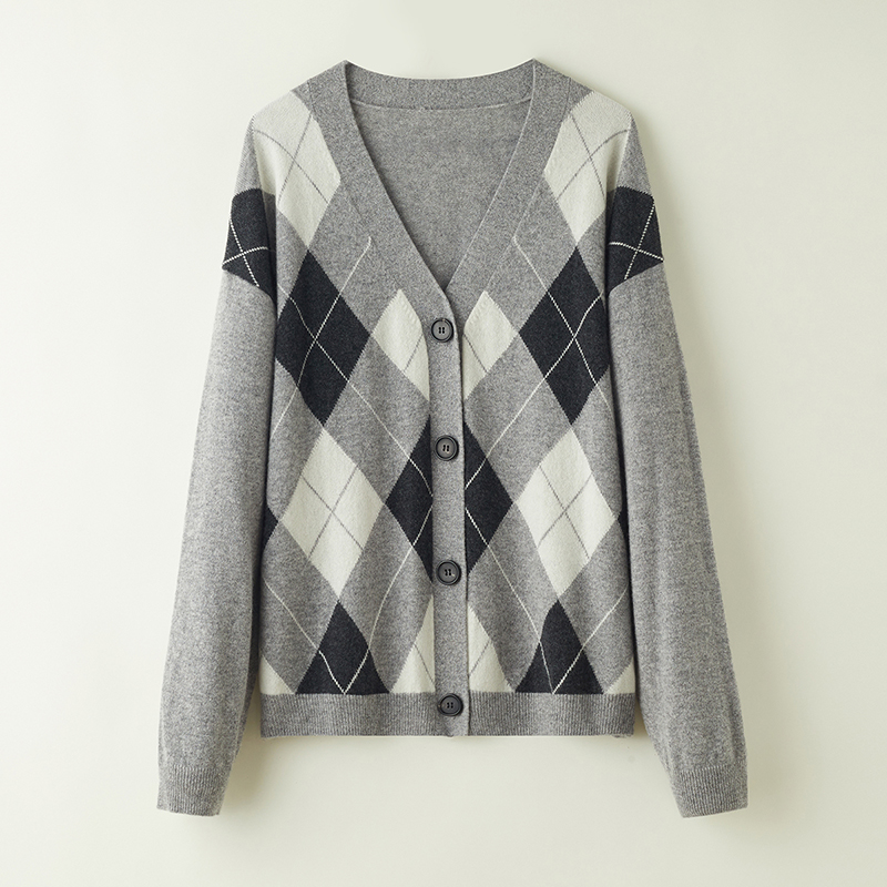 思诺芙德V领菱格山羊绒开衫女25秋冬新款学院风宽松毛衣针织外套