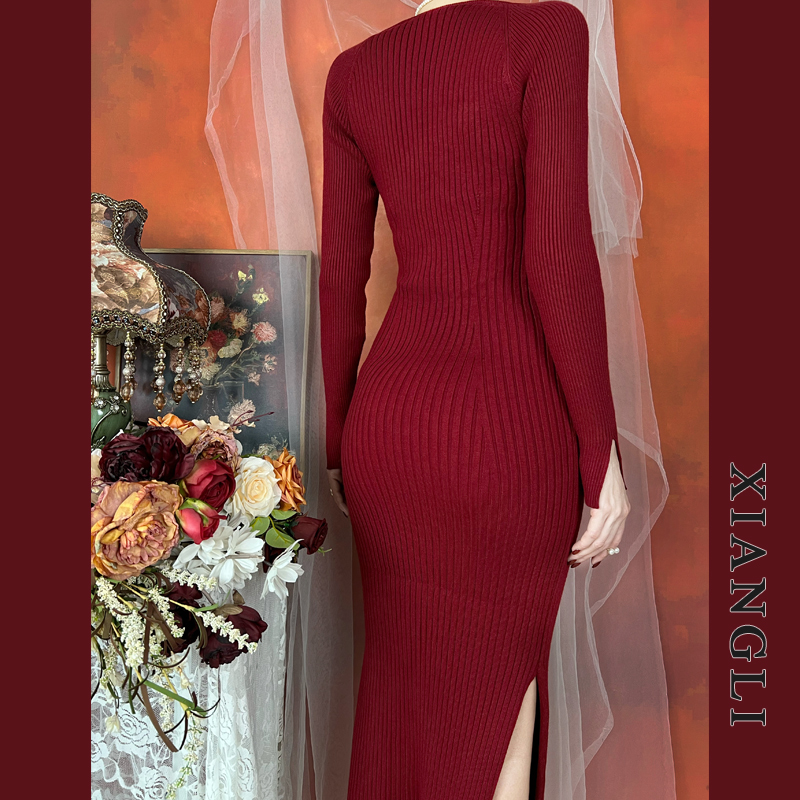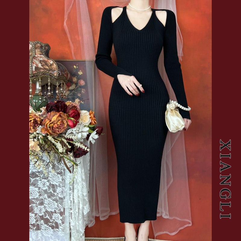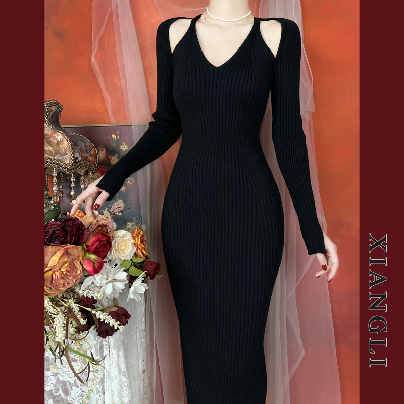 巷里法式复古针织连衣裙秋冬长袖吊带修身显瘦女神性感纯欲风长裙