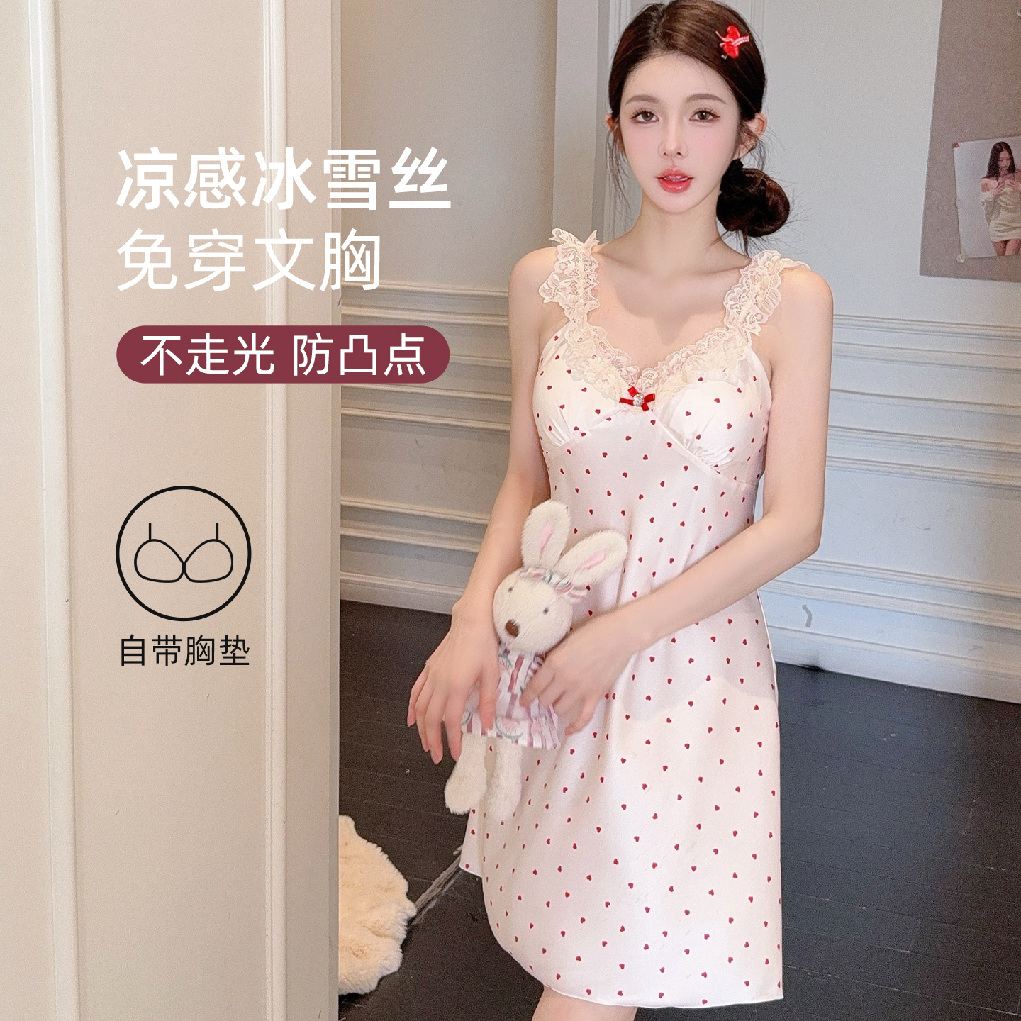 乐姿梦爱心夏季睡衣女凉感冰丝纯欲性感吊带睡裙蕾丝带胸垫家居服
