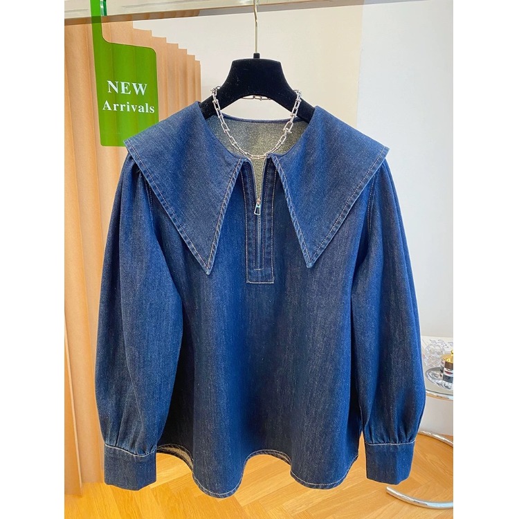 复古高级感蓝色牛仔衬衫女春秋宽松韩版半拉链拼接娃娃领套头上衣