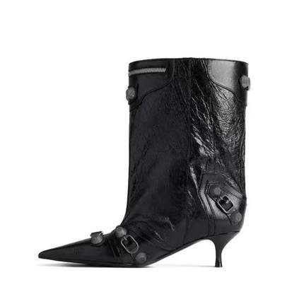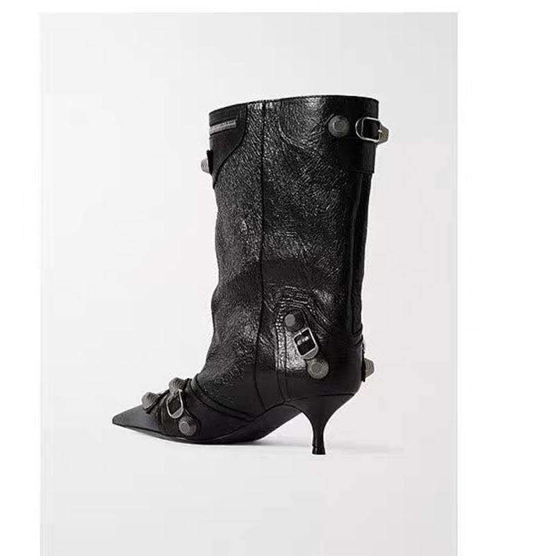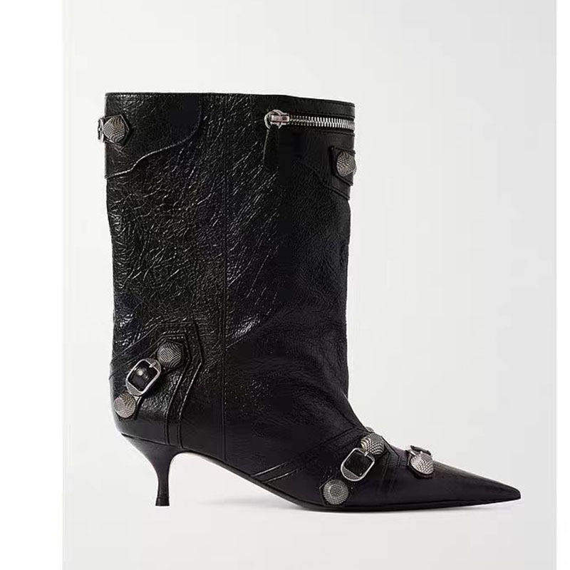 2025外贸女鞋尖头细跟高跟一脚蹬直筒铆钉针扣大码中筒靴女靴