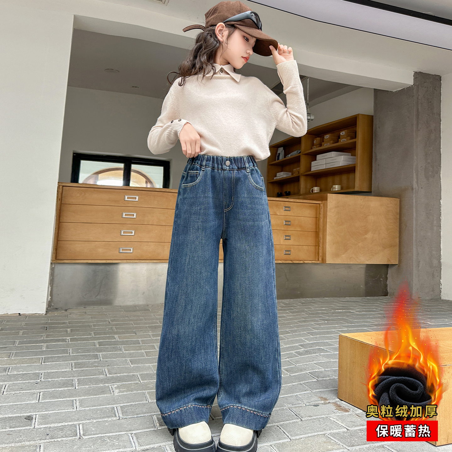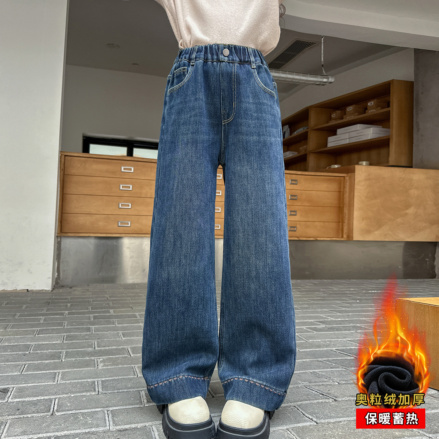 女童加绒牛仔裤秋冬儿童加厚一体绒裤子冬季女孩大童好看直筒长裤
