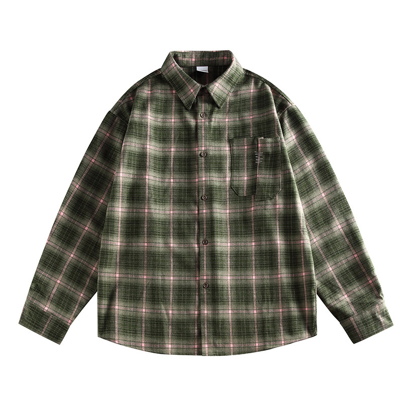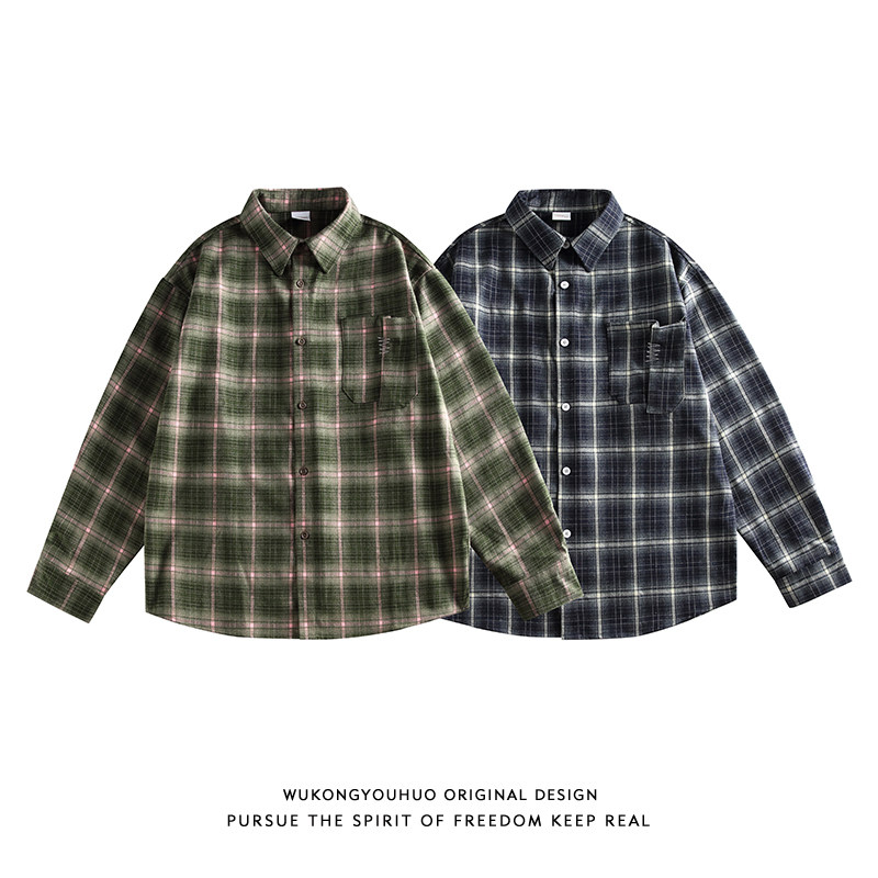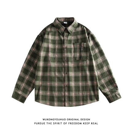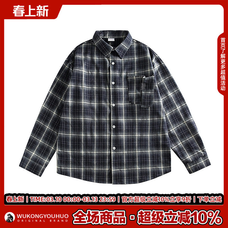 悟空有货潮牌美式复古格子长袖衬衫男女秋季街头宽松潮流休闲衬衣