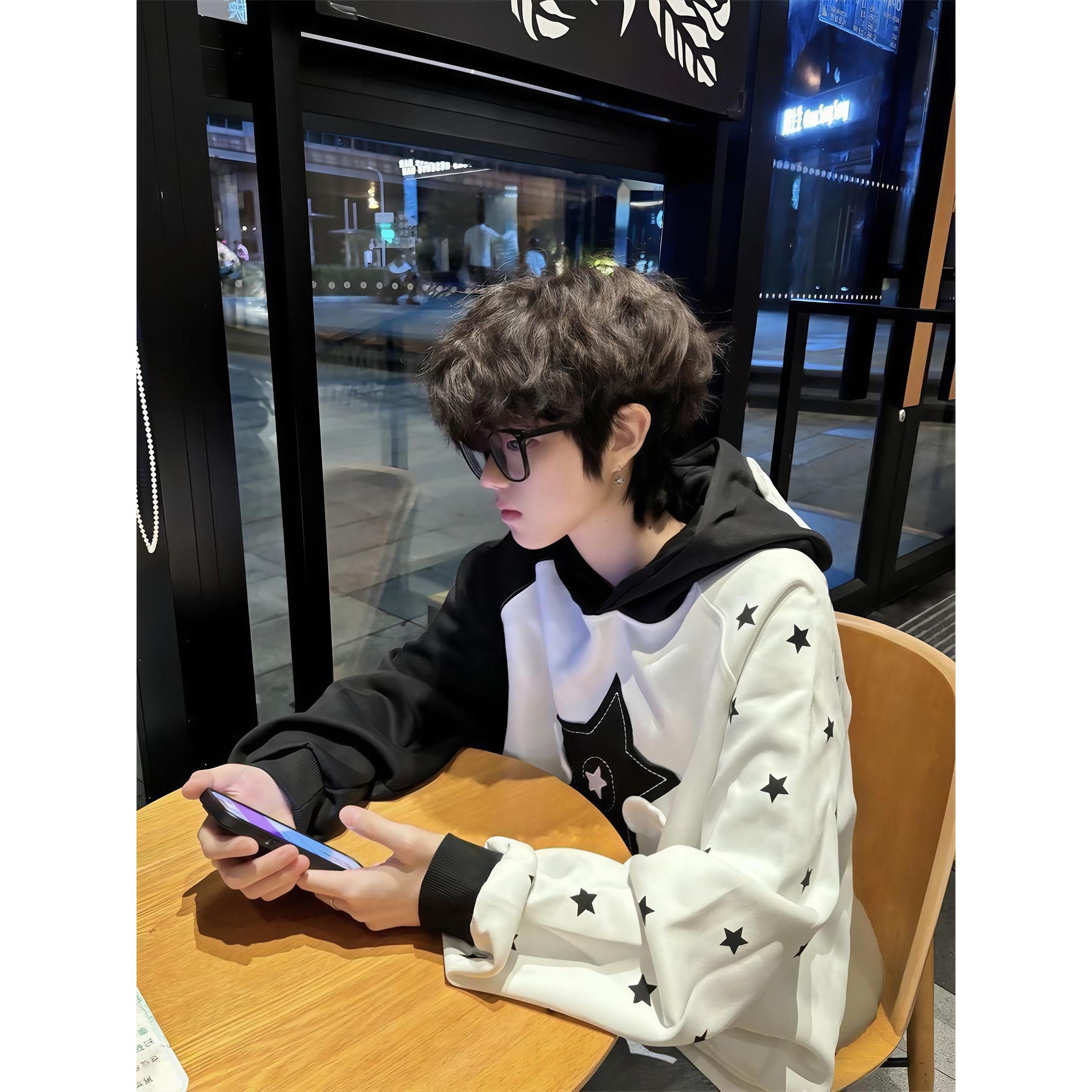美式高街星星贴布刺绣小翅膀卫衣男装秋季宽松帽衫情侣插肩袖外套
