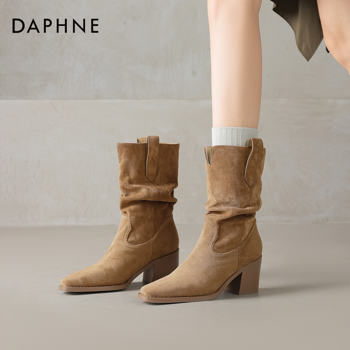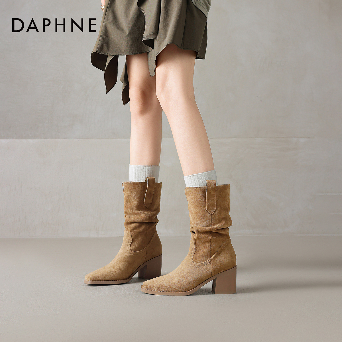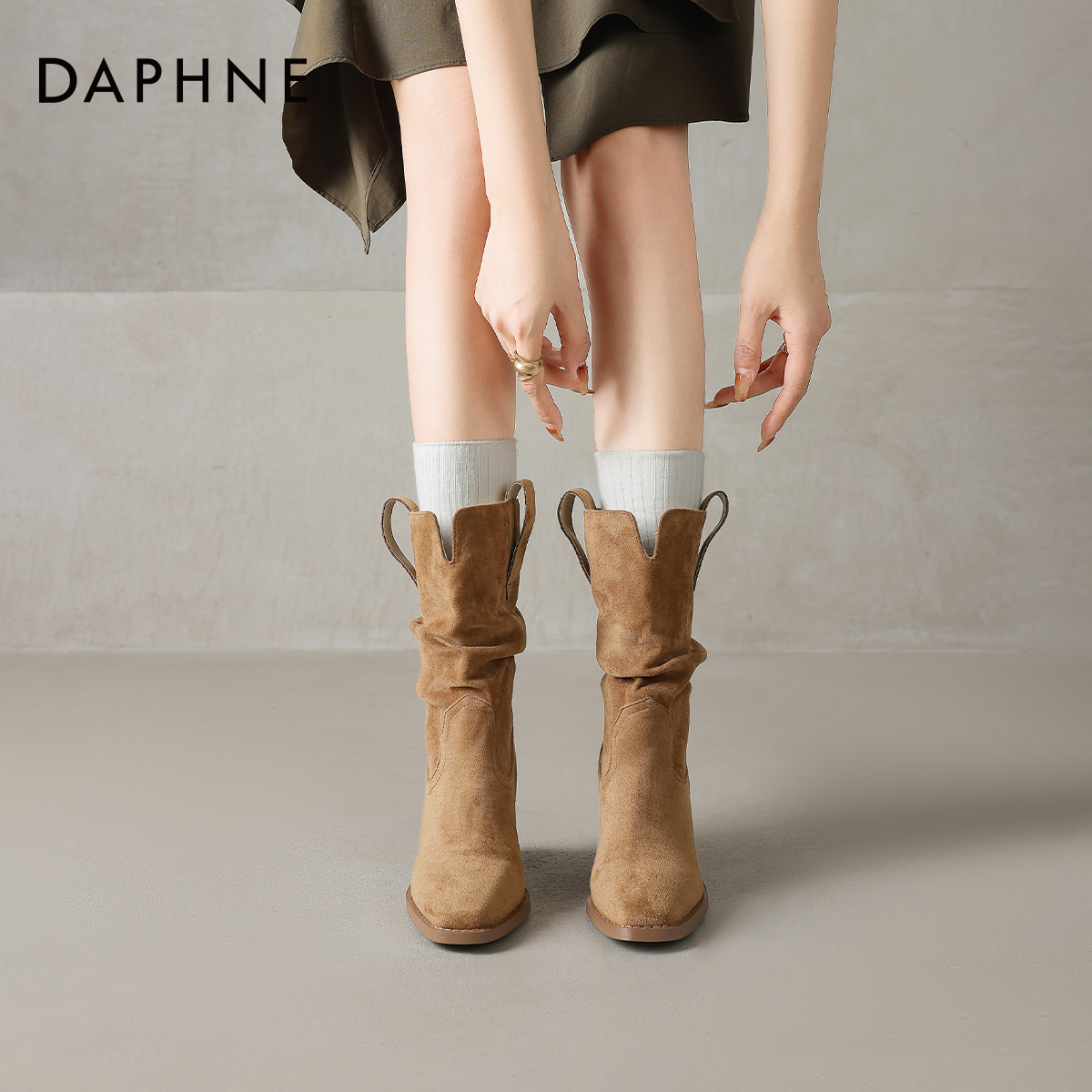 达芙妮尖头短靴女2025新款秋冬季加绒粗跟堆堆瘦瘦靴美拉德高跟鞋