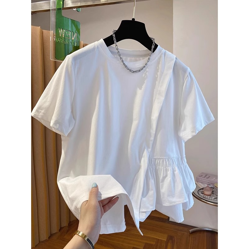 夏装新款大码女装胖妹妹别致不规则设计感收腰短袖衬衫松显瘦上衣