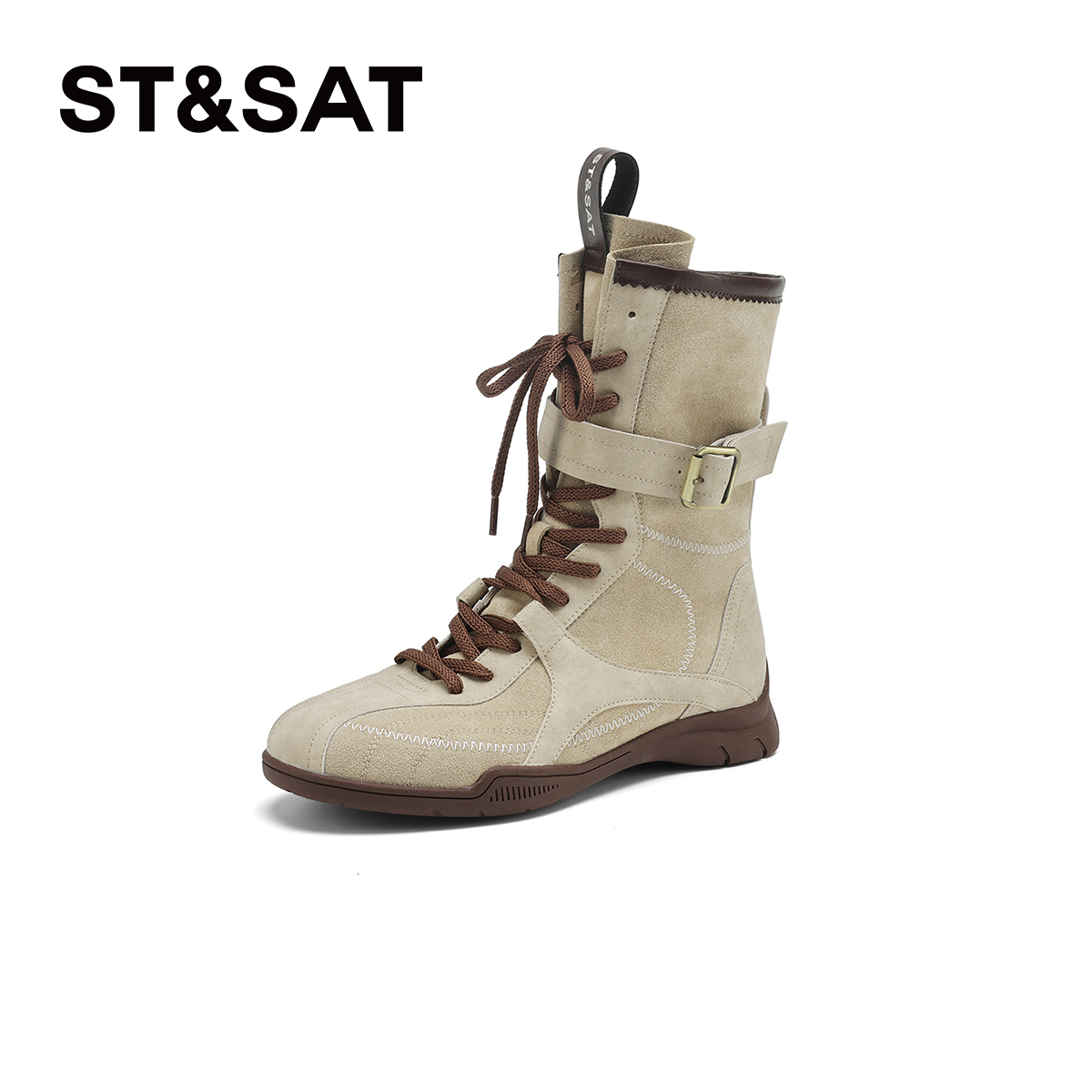 星期六英伦风拳击靴马丁靴女款2025新款秋冬复古绑带中筒靴短靴子