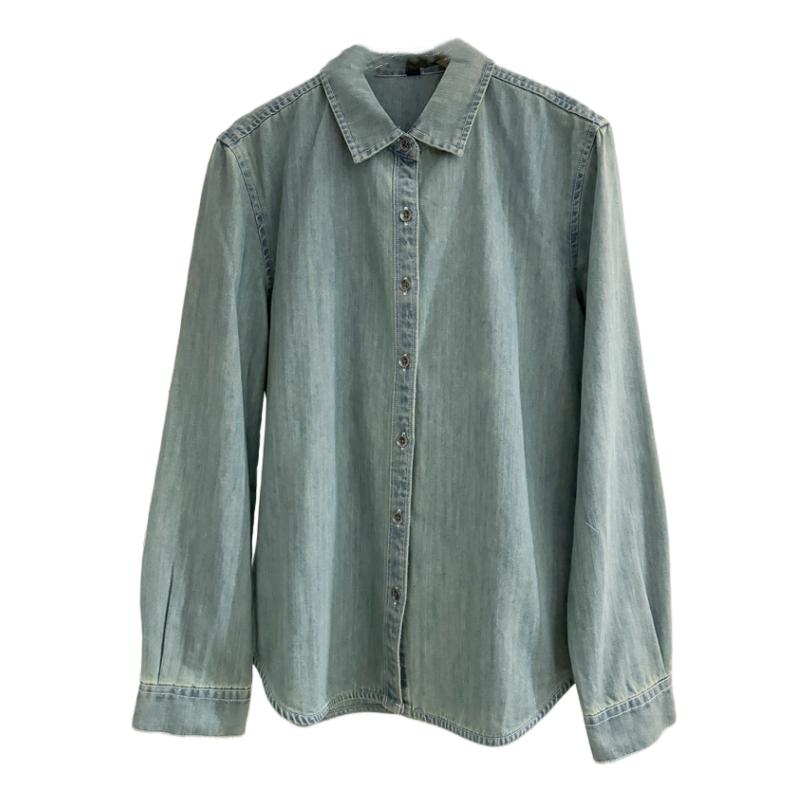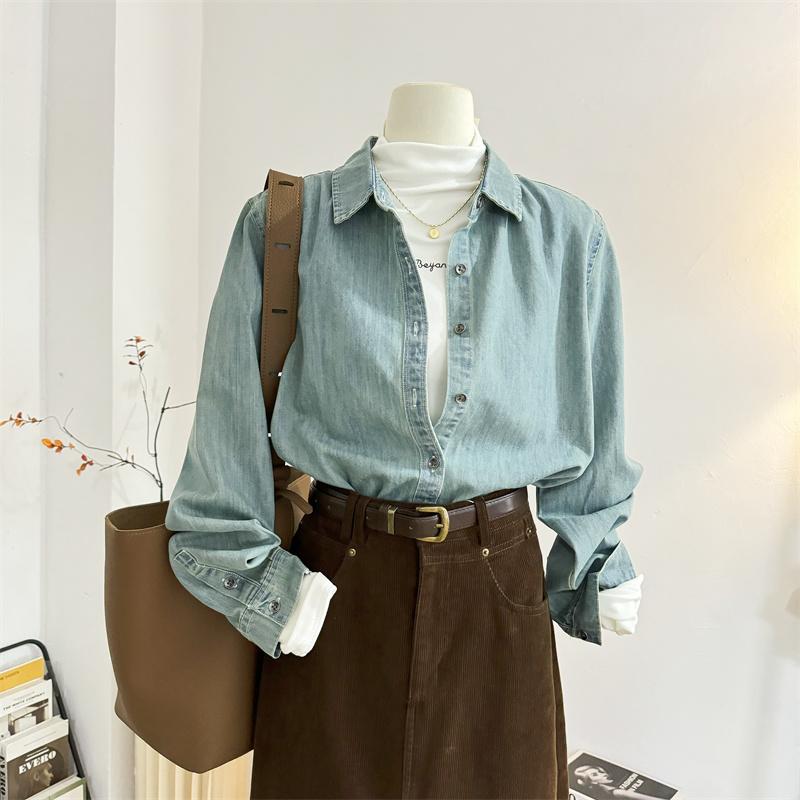 复古水洗浅蓝色正肩牛仔衬衫女长袖秋冬宽松内搭叠穿衬衣港风上衣