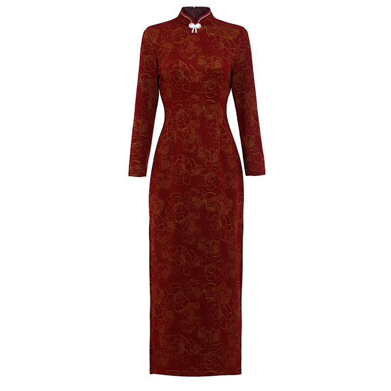 旗袍中年妈妈秋冬长袖加绒加厚婚礼服大码复古改良优雅长款连衣裙