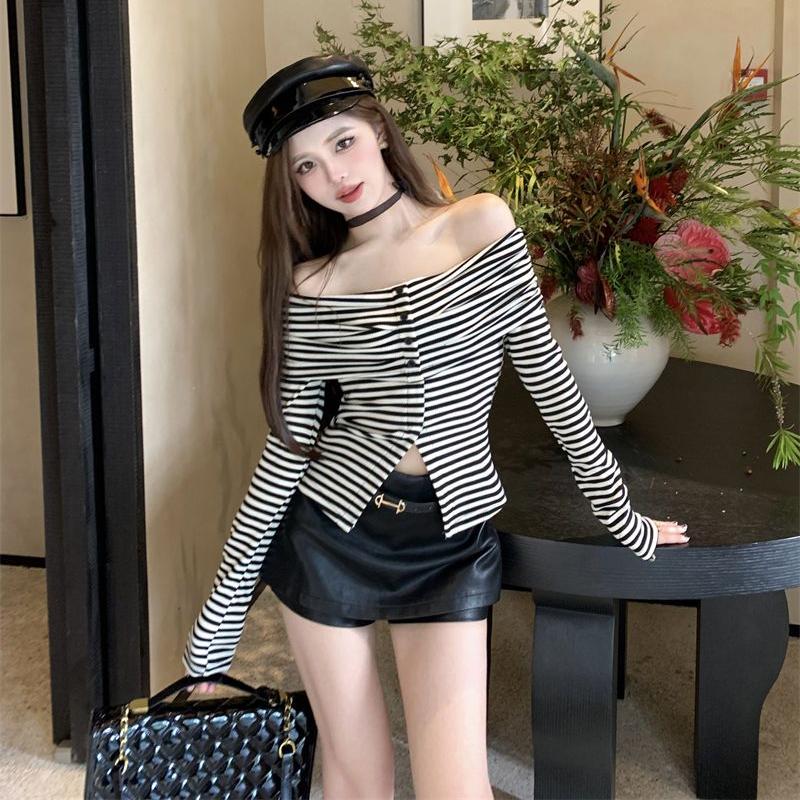 秋冬露肩锁骨修身短款开叉纯欲风一字肩条纹针织长袖女上衣打底衫