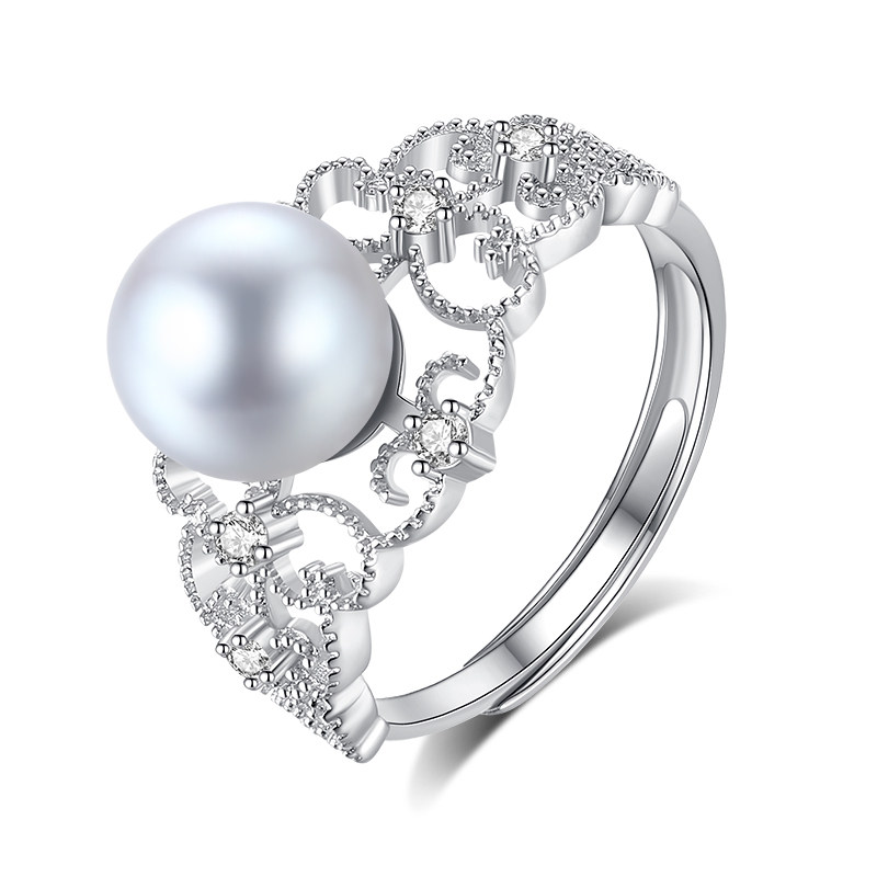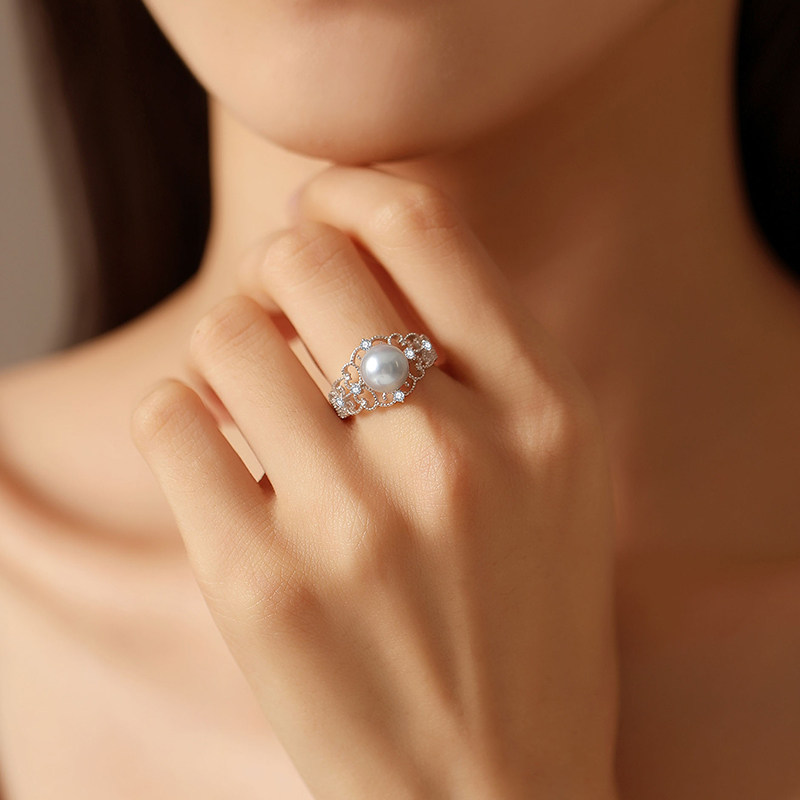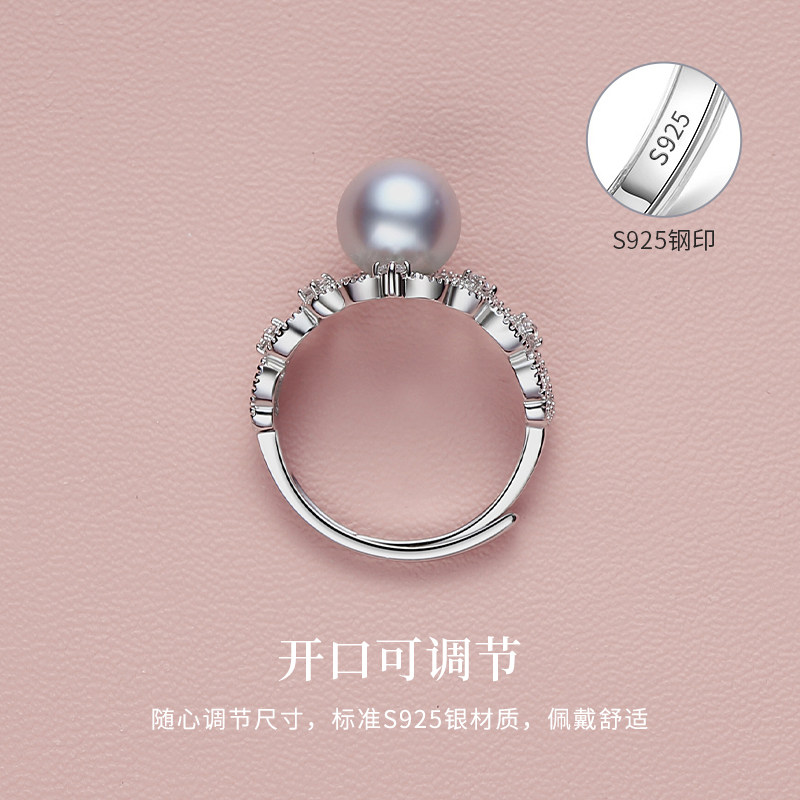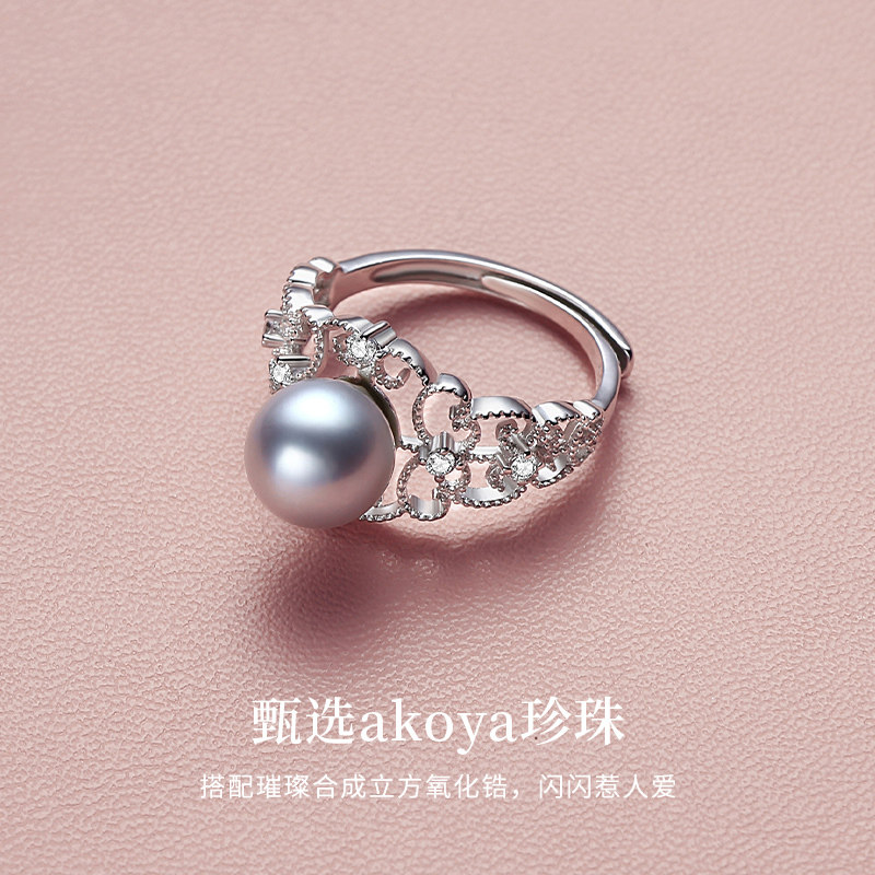 akoya海水珍珠戒指女真多麻色单颗法式复古蕾丝指环开口调节手饰