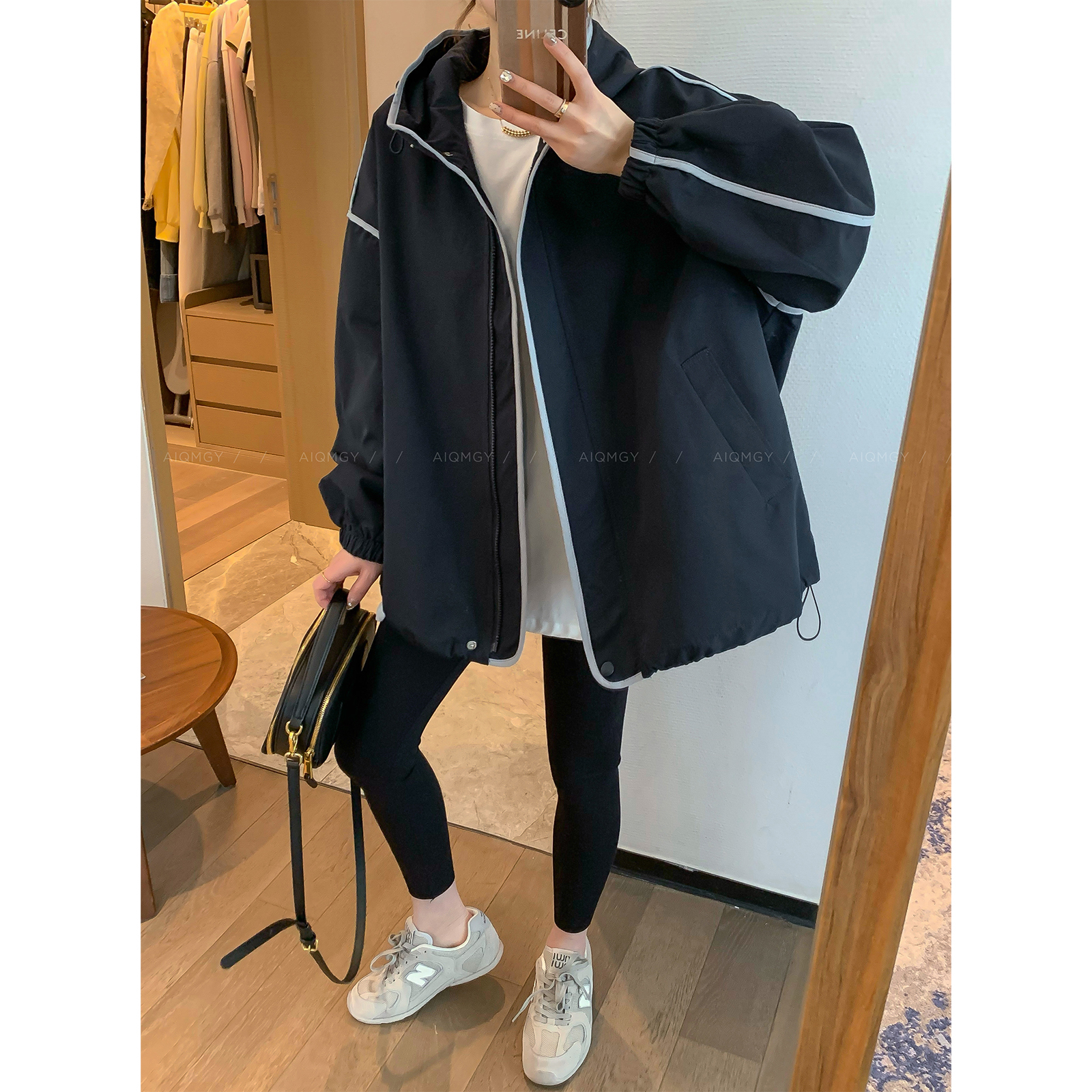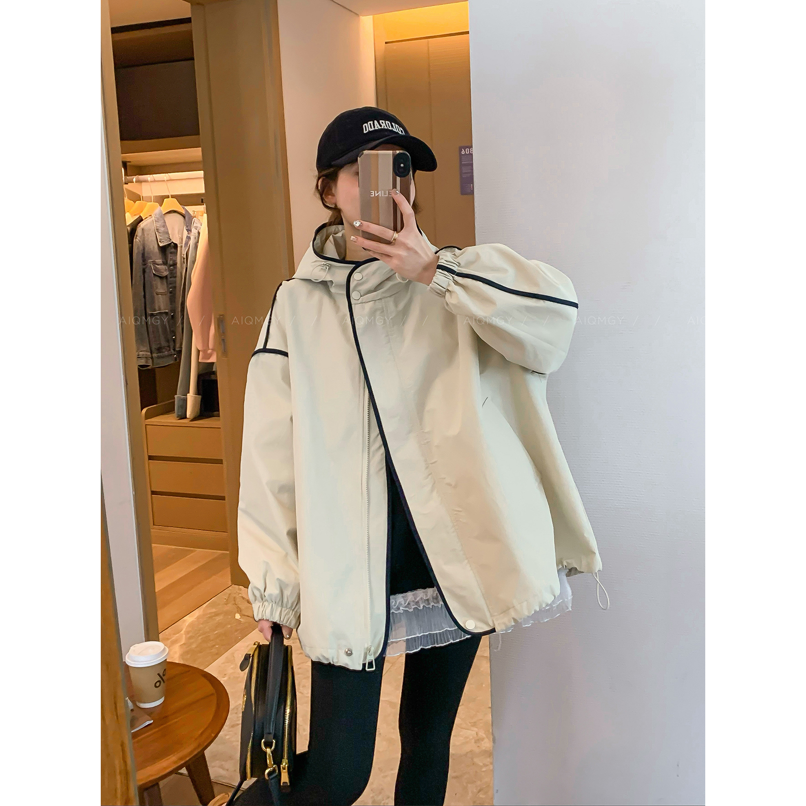 爱情魔鬼鱼 蓝色撞色连帽休闲外套女2025年秋季新款宽松百搭上衣