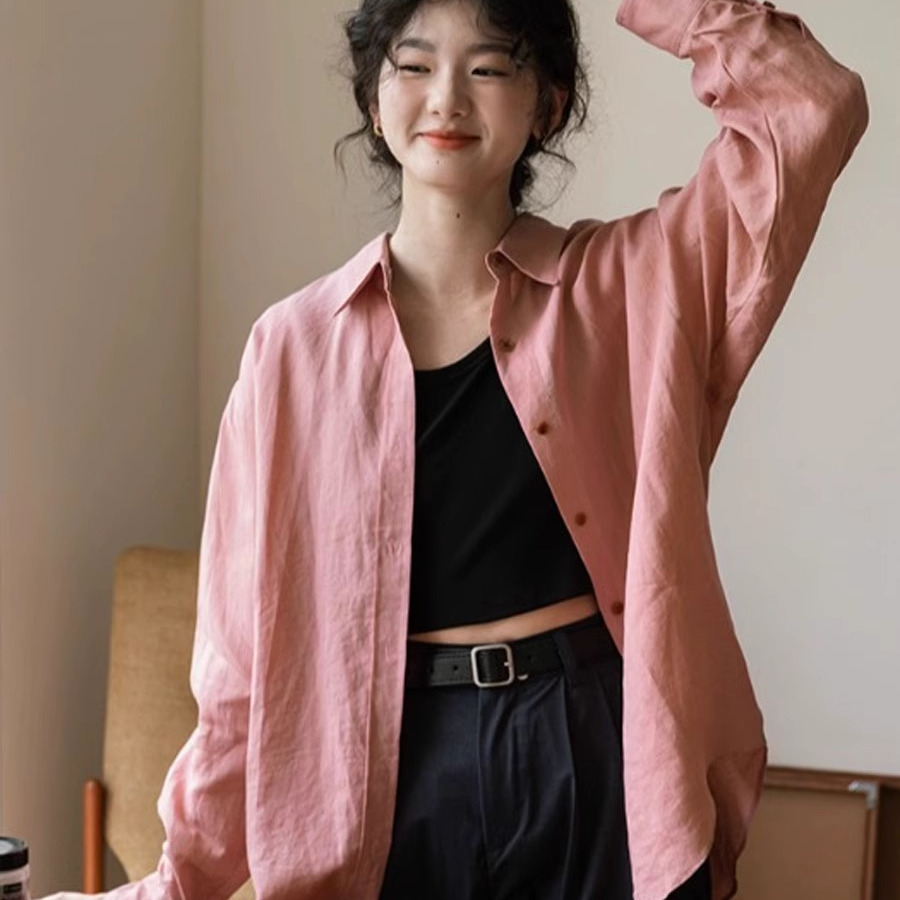 2025秋装新款韩系玫瑰粉长袖衬衫女宽松慵懒风复古港味法式上衣