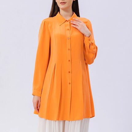 真丝30姆米重磅橙色POLO领单排扣做旧砂洗长袖直筒桑蚕丝衬衫