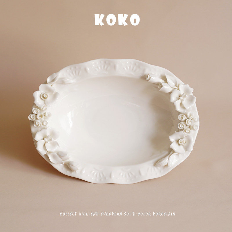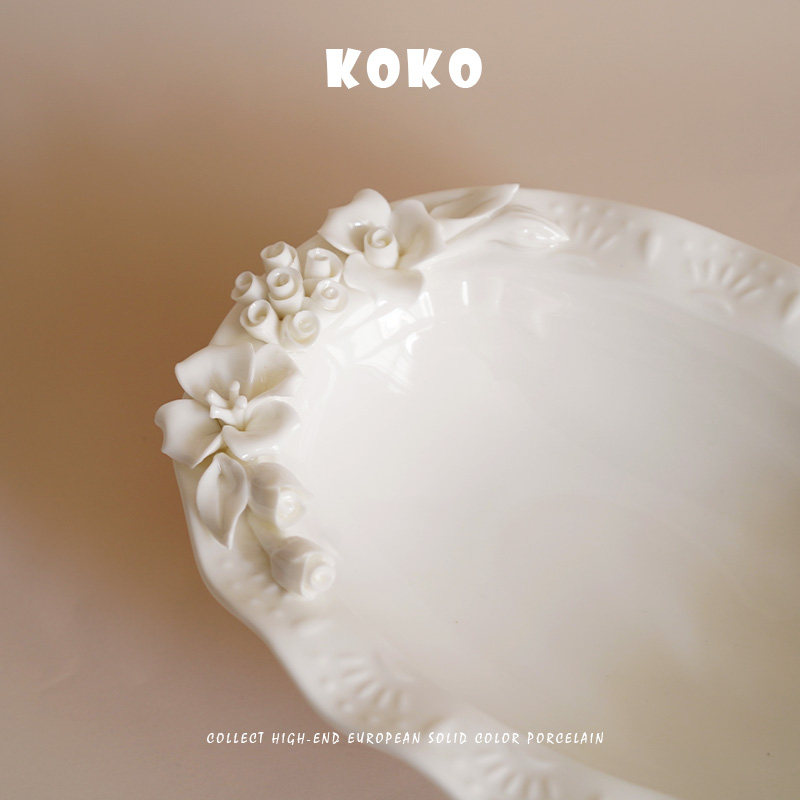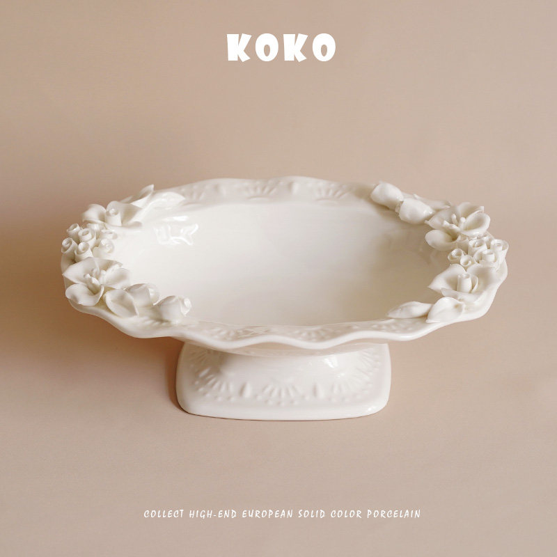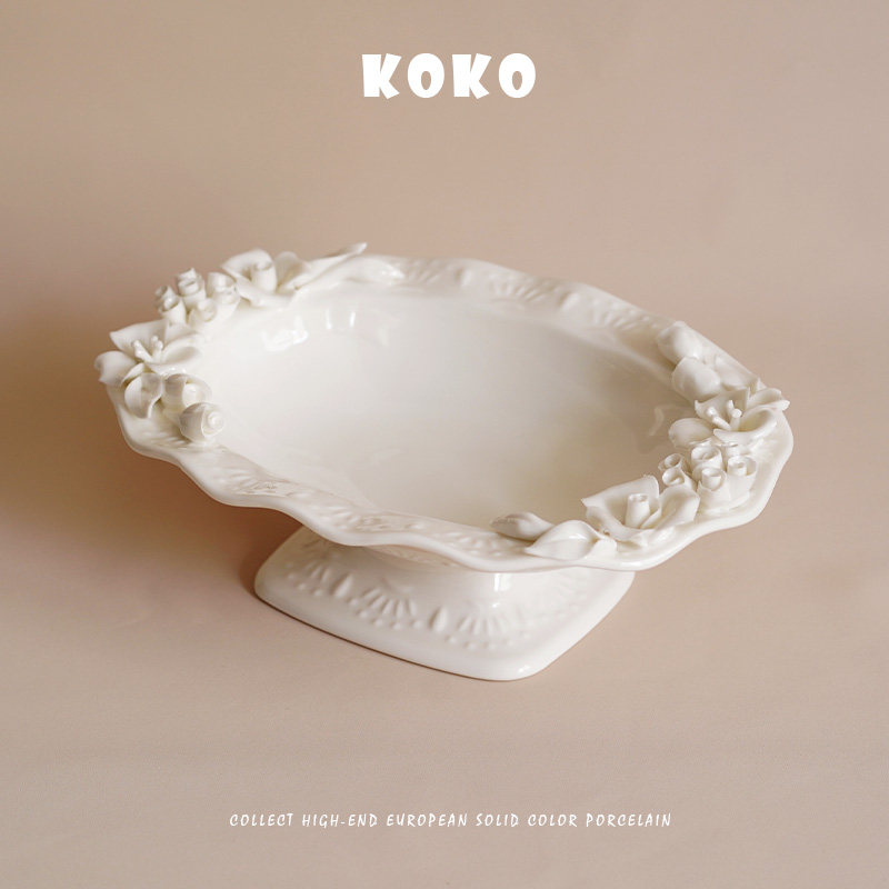 KOKO 出口欧式浮雕手捏花高脚托盘陶瓷水果盘下午茶点心摆盘装饰
