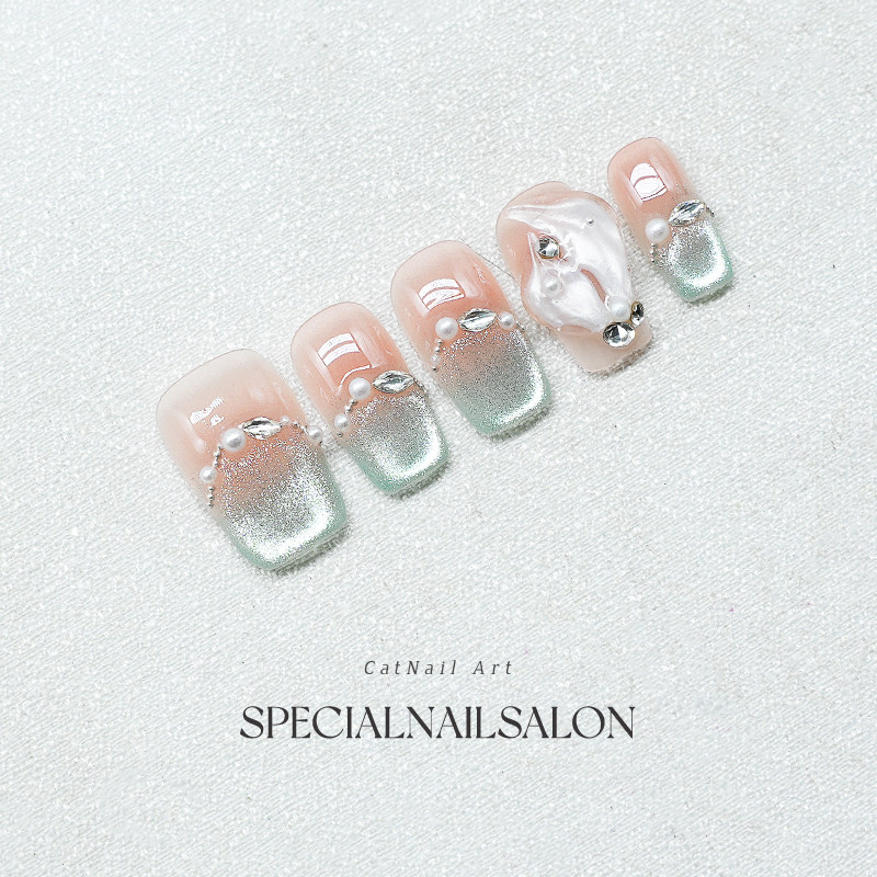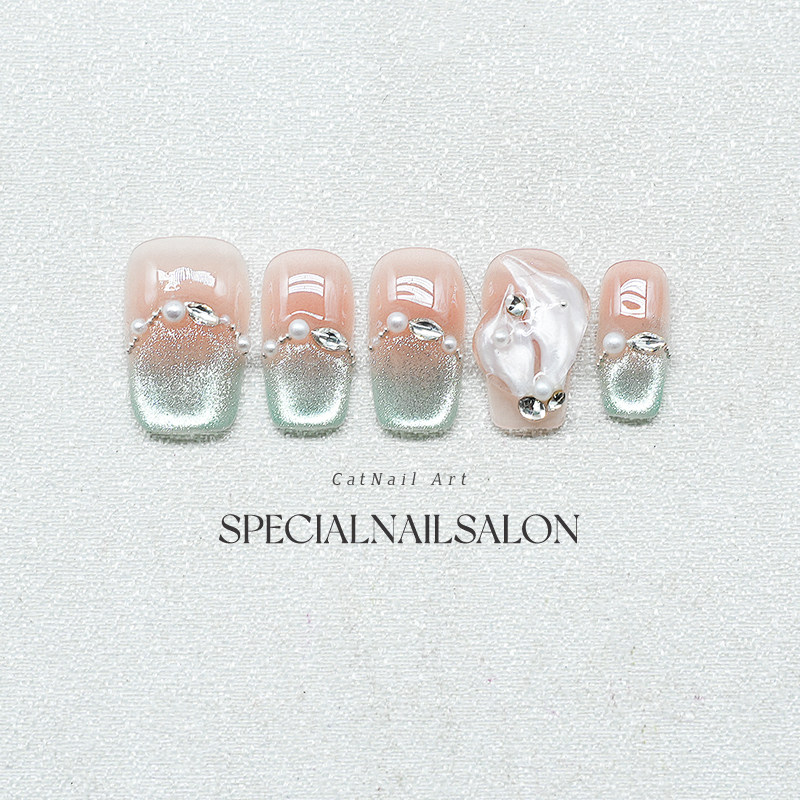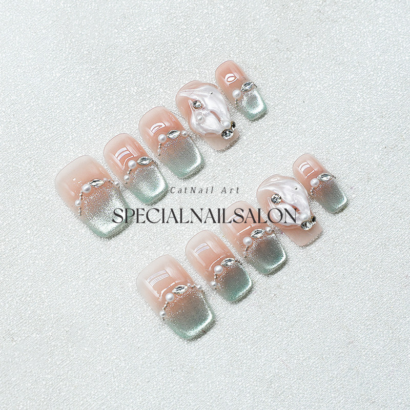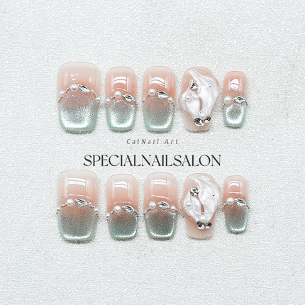 【海雾沁珠】纯手工穿戴美甲夏季鱼尾撞色碧海蓝细闪温柔显白美甲