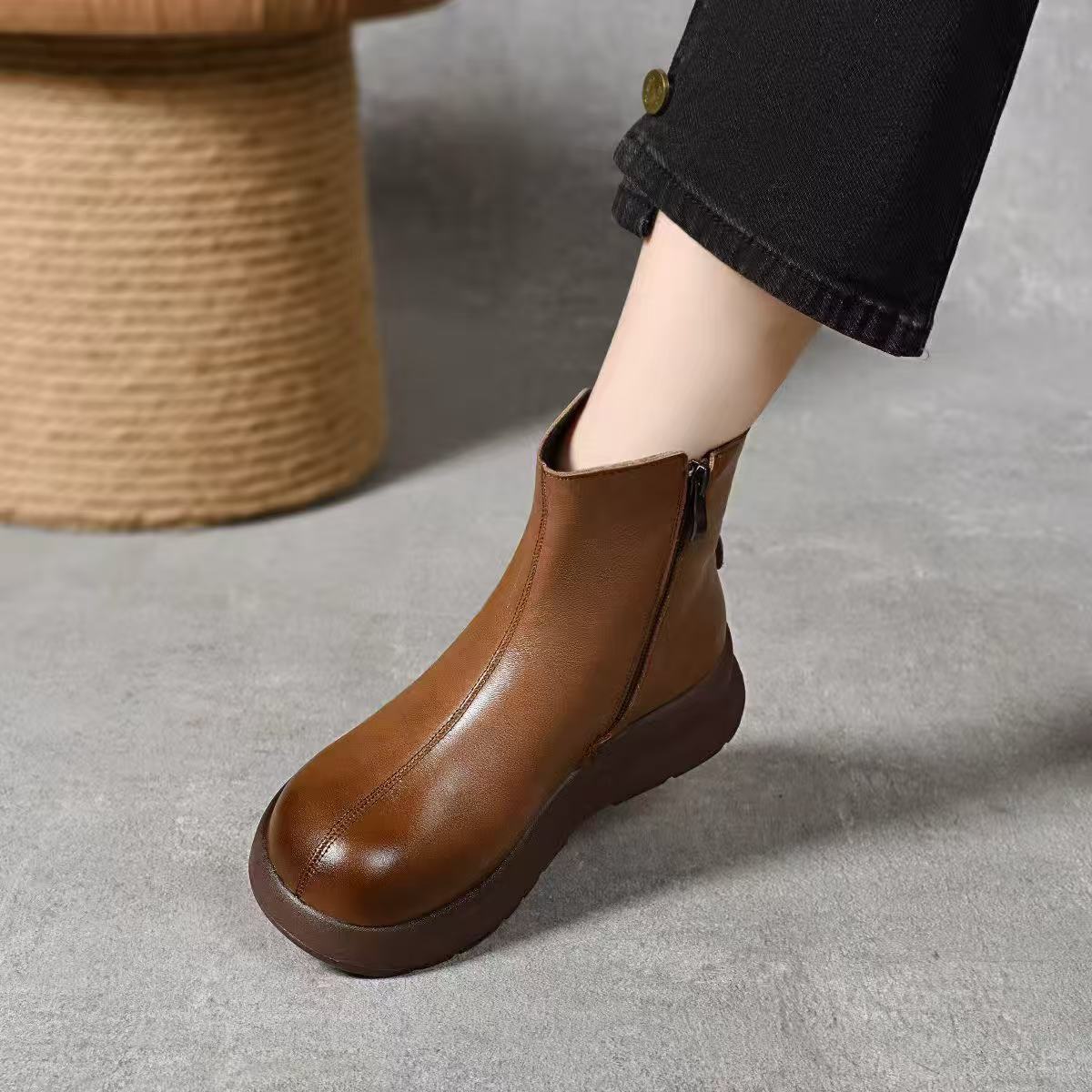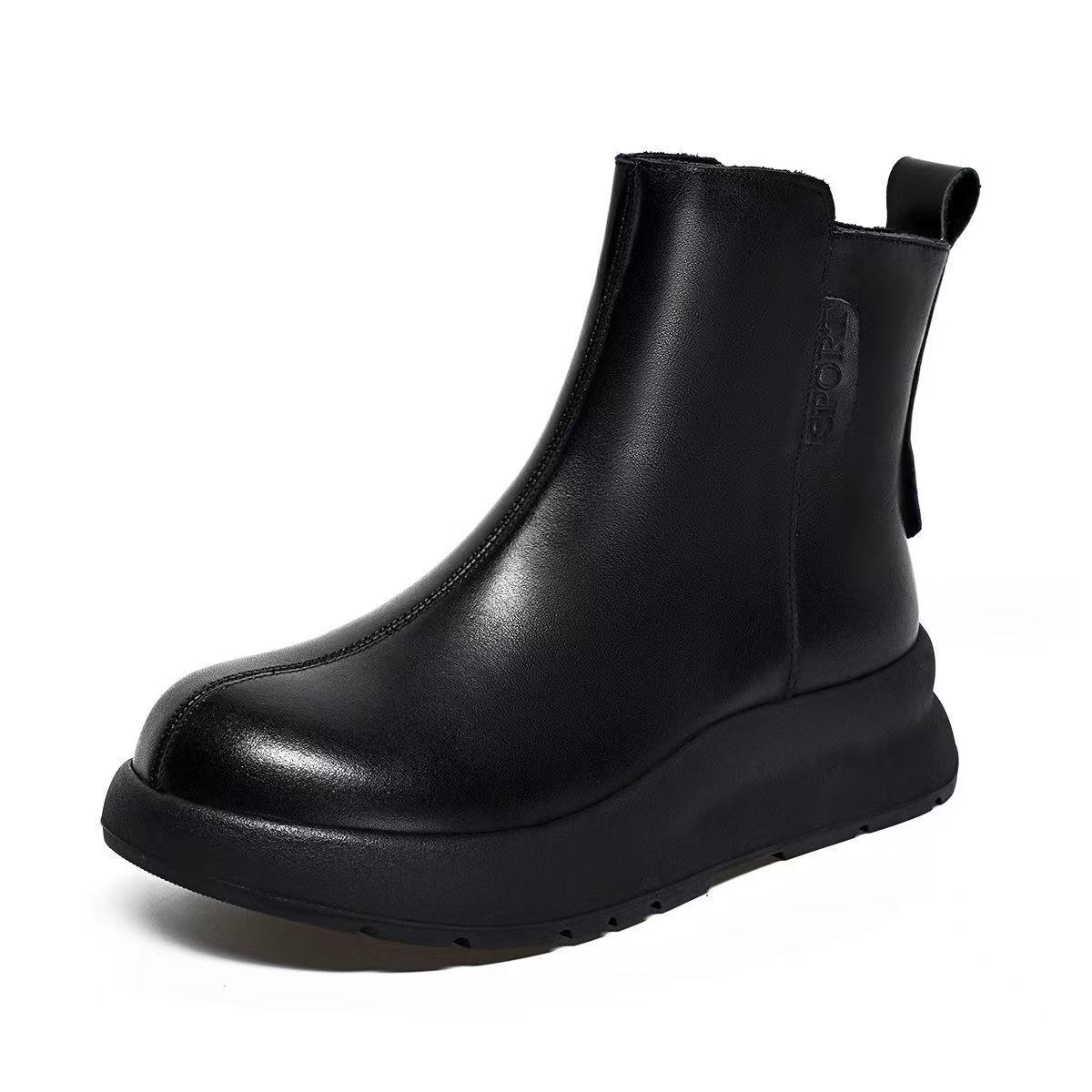2025秋冬新款真皮圆头侧拉链厚底短靴马丁靴女靴坡跟棉靴加绒保暖