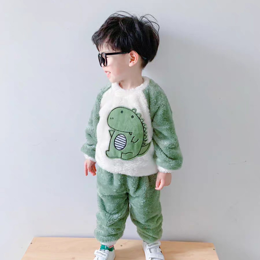 男童珊瑚绒睡衣儿童秋冬法兰绒套装女孩加厚宝宝恐龙卡通家居服