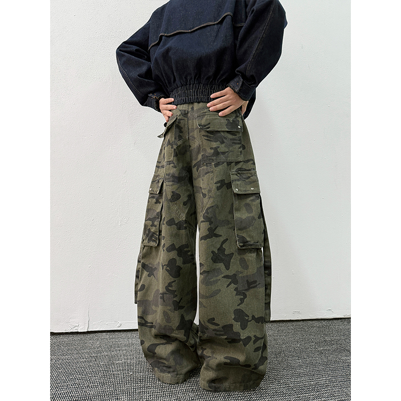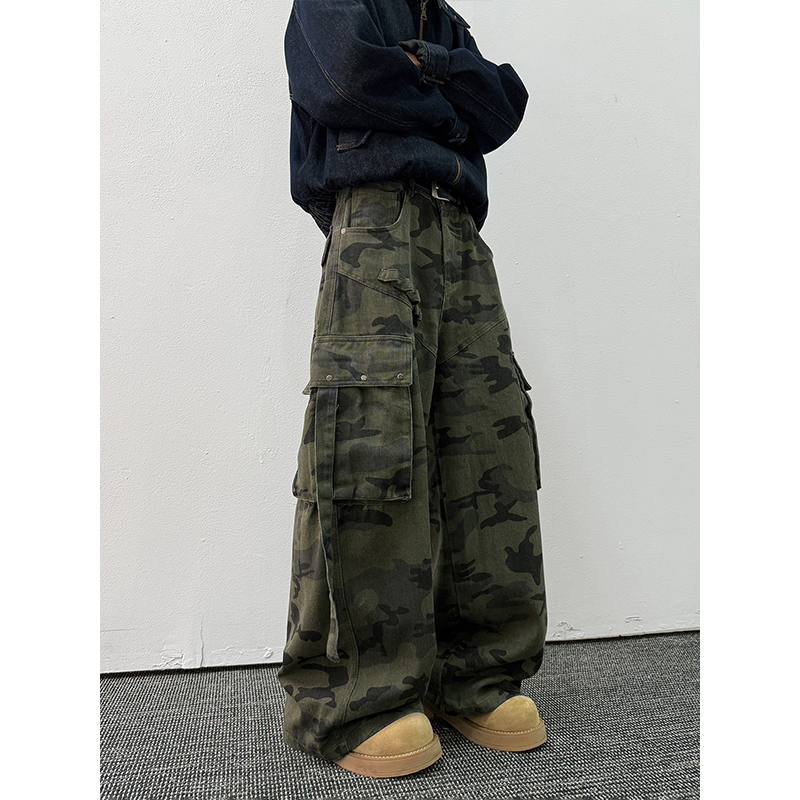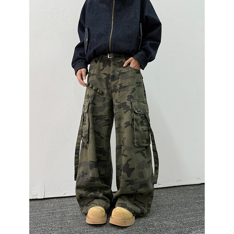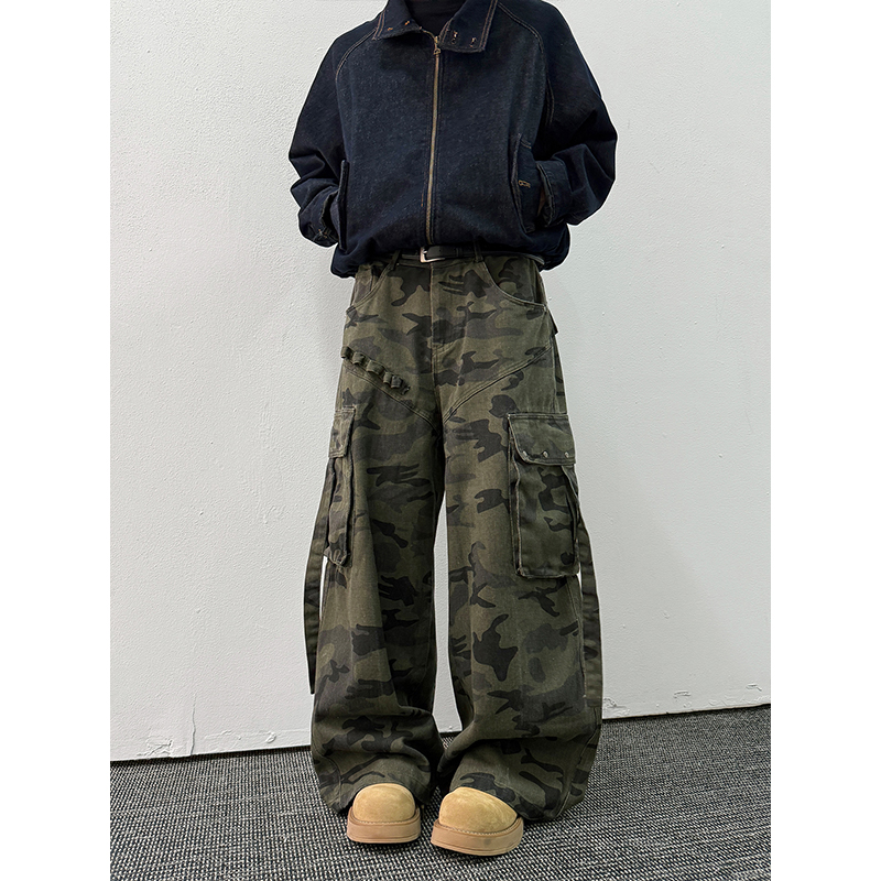 美式多口袋迷彩工装牛仔长裤男女显瘦cleanfit堆积感弯刀褶皱裤子