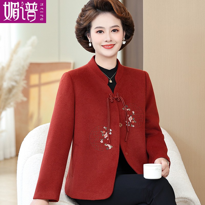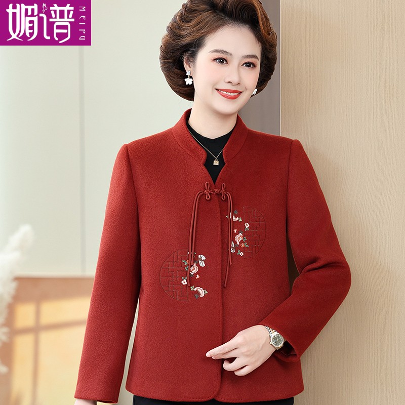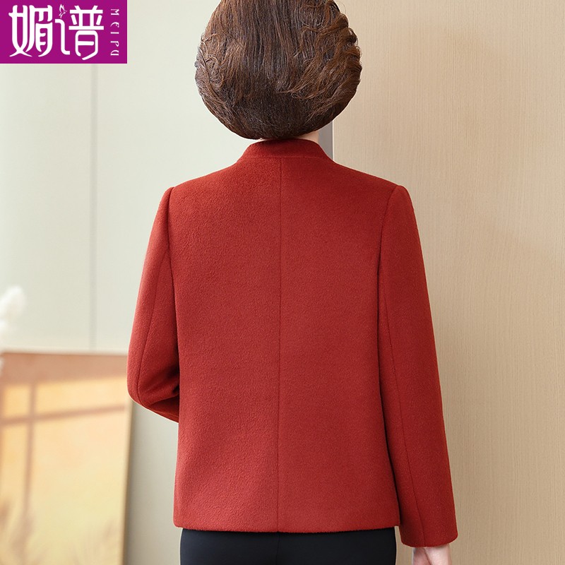 婚礼妈妈装短款毛呢外套2024秋冬新款红色中老年女婚宴喜婆婆上衣