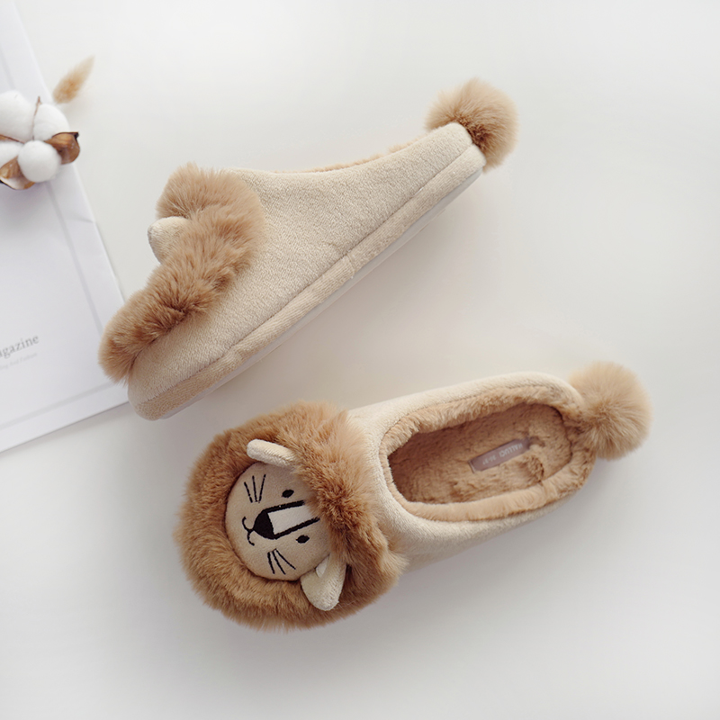 内加绒秋冬加厚保暖小狮子室内保暖拖鞋女橡胶底防滑可爱包跟棉鞋