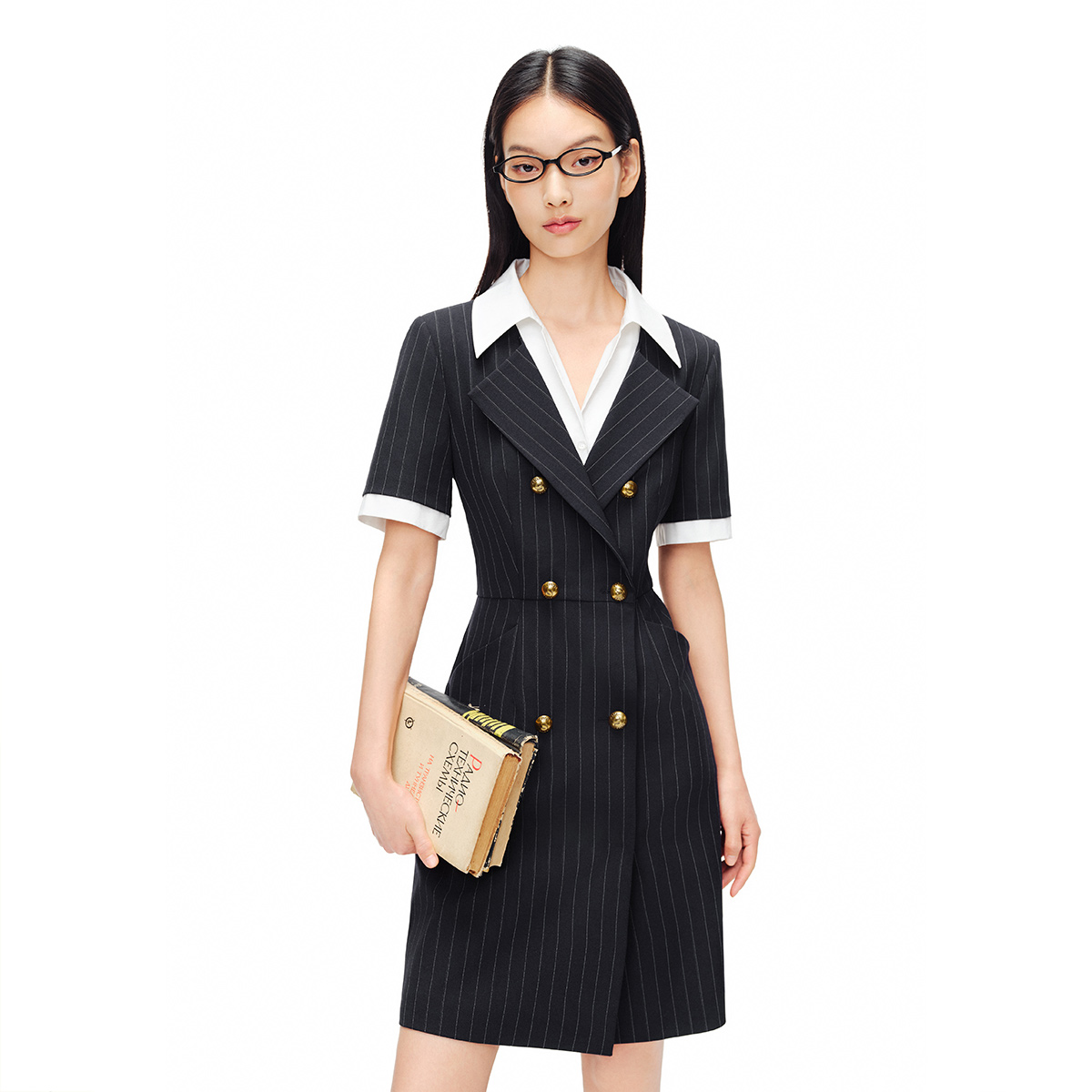 SALT.P可颜2024夏撞色衬衫领假两件收腰条纹西装裙连衣裙
