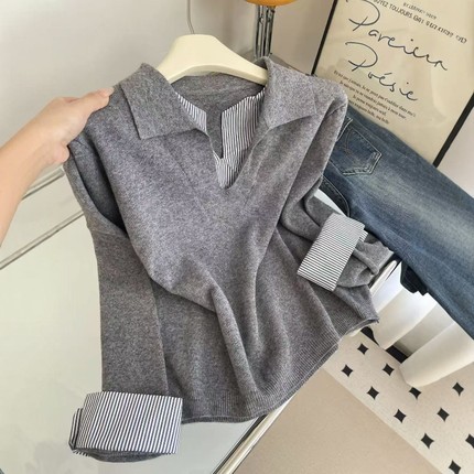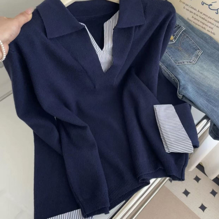 韩版通勤条纹拼接假两件针织衫女