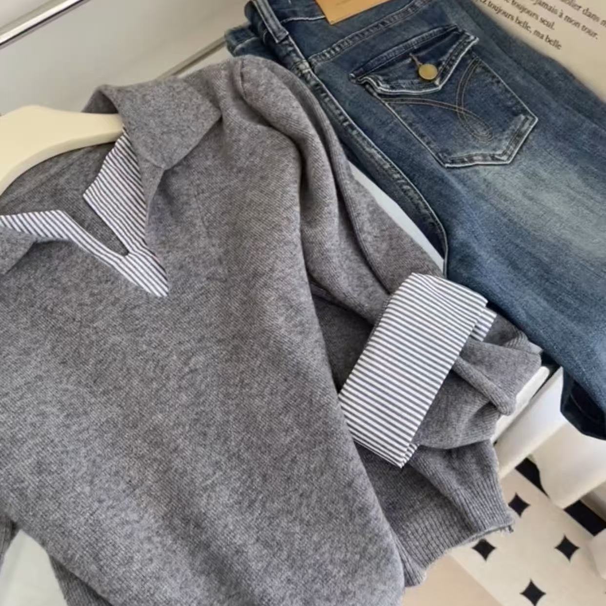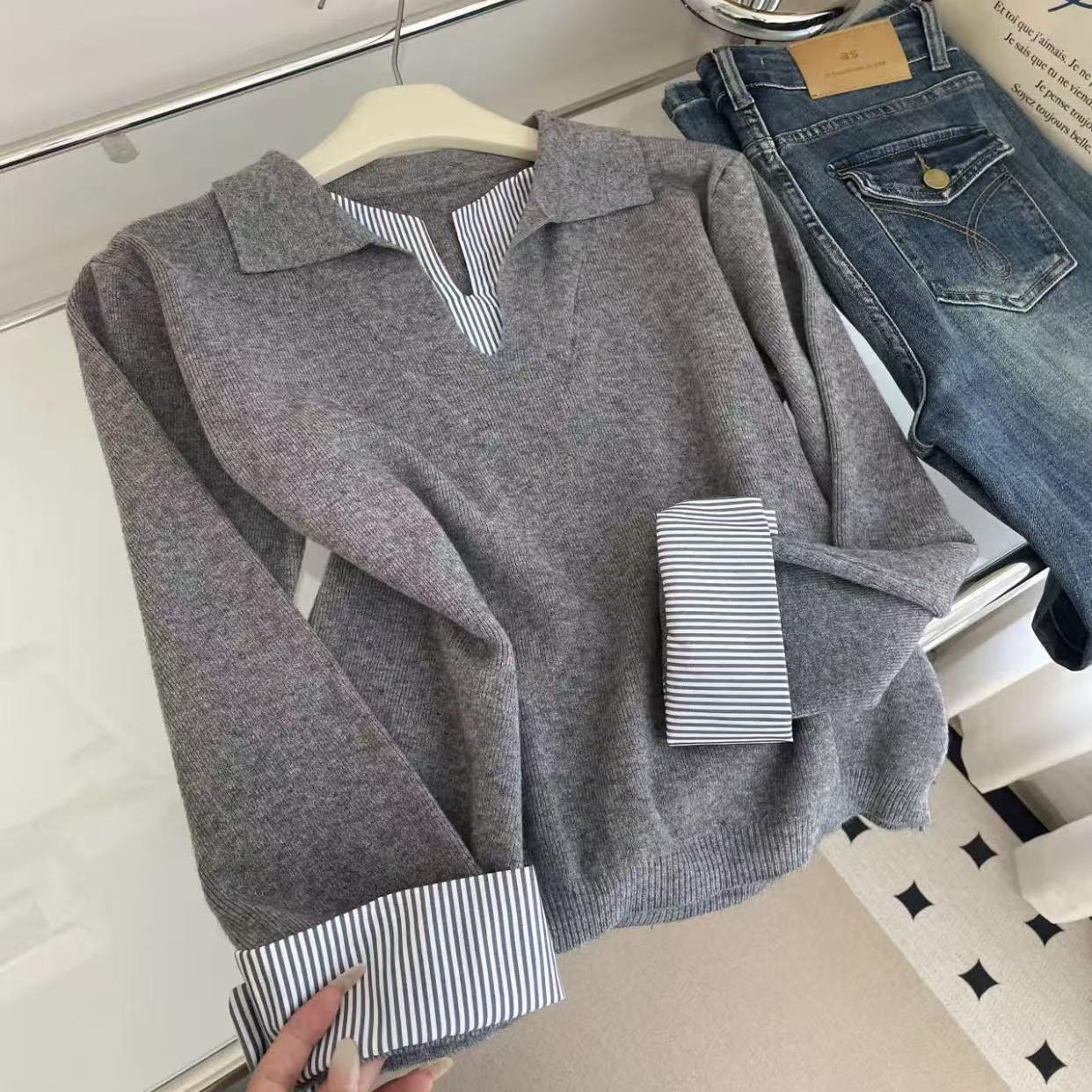 韩版通勤高级感条纹拼接假两件上衣女秋季新款气质百搭套头针织衫