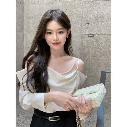 ByYou 2025秋季新款气质缎面荡领白色衬衫女宽松珍珠吊带长袖衬衣