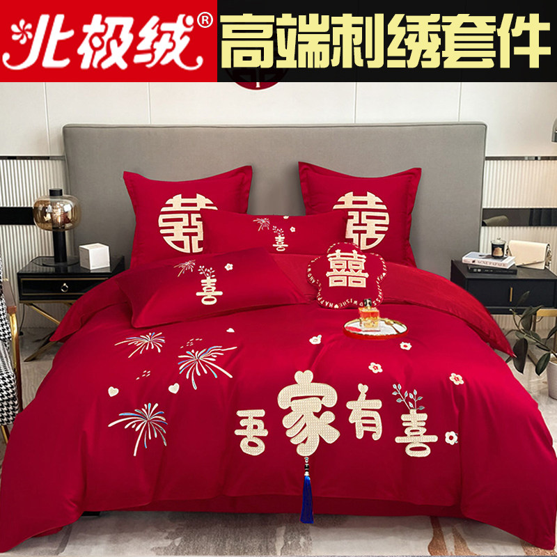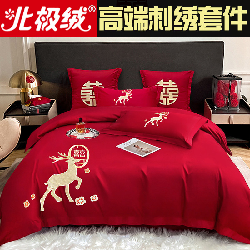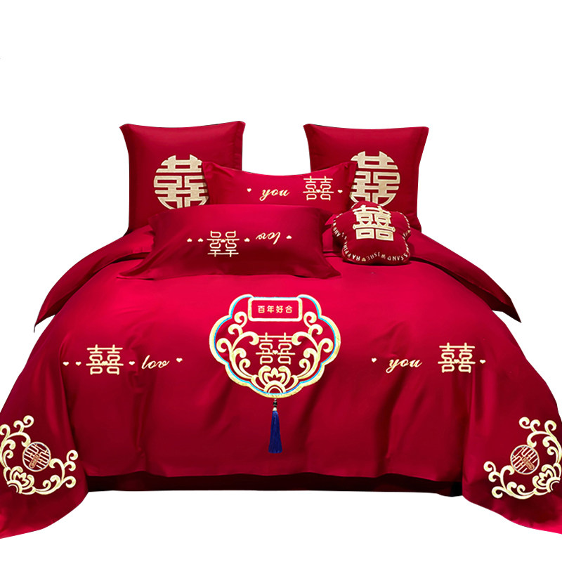 高档结婚四件套大红简约刺绣中式新房婚庆床上用品绣花喜被床单笠