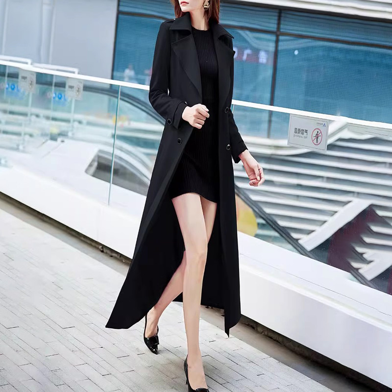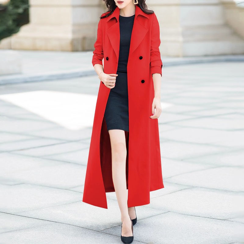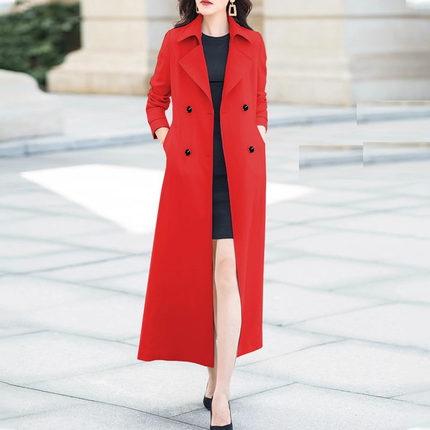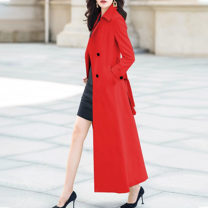 2025秋新款时尚气质英伦法式红色双排扣长款风衣修身显瘦过膝外套
