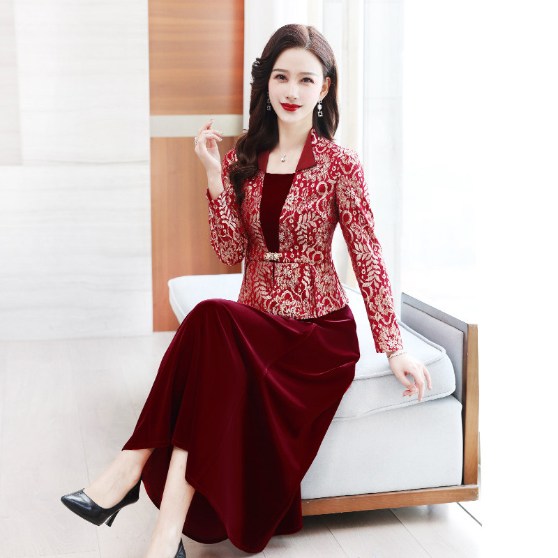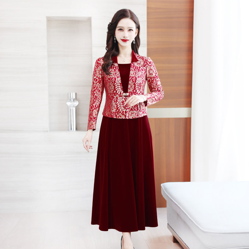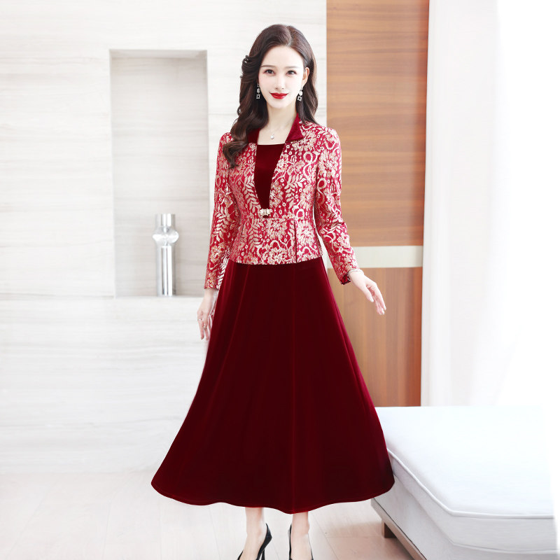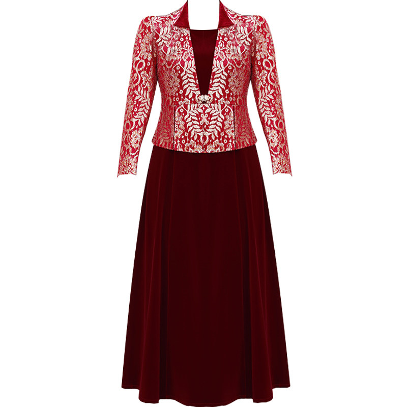 喜婆婆婚宴装春秋红色礼服蕾丝平时可穿中年妈妈假两件连衣裙高贵
