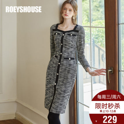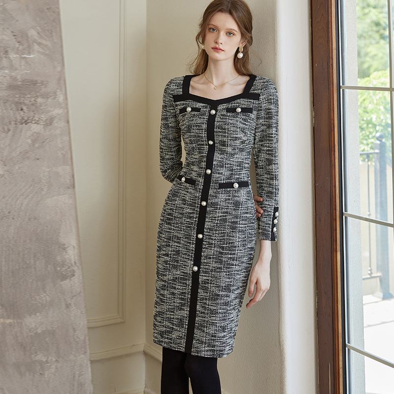 罗衣法式小香风针织连衣裙女2025冬季新款方领收腰修身裙子09740