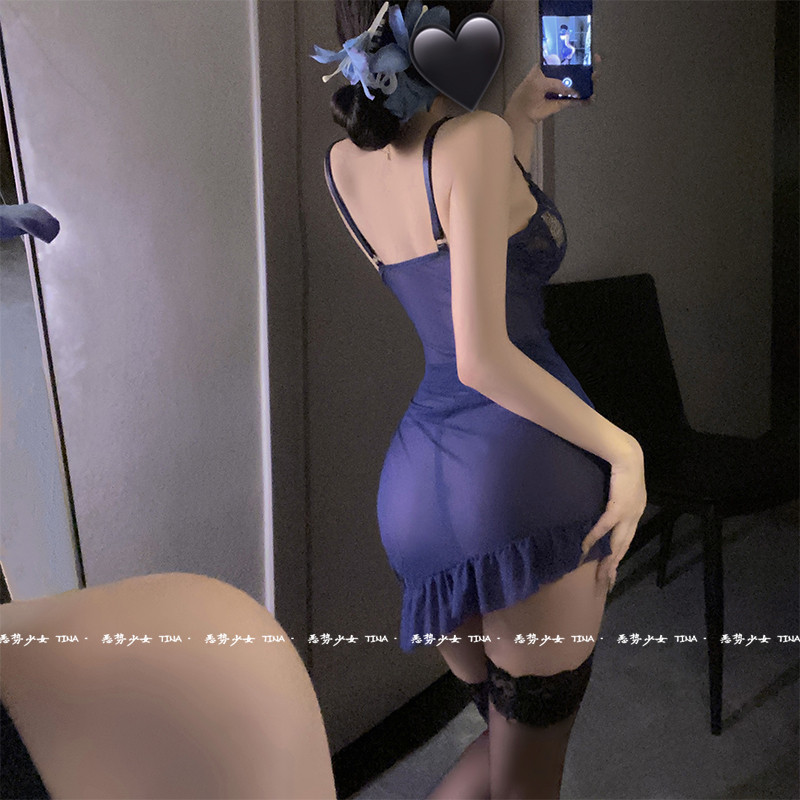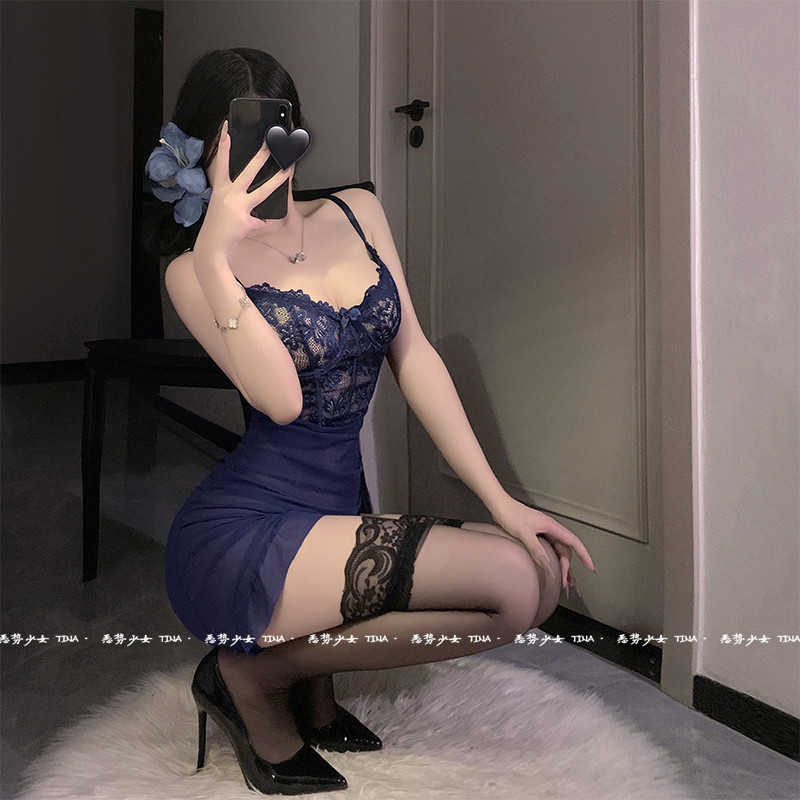 蓝色妖姬迷人纯欲性感网纱吊带包臀裙紧身收腰小胸诱惑约会睡裙女
