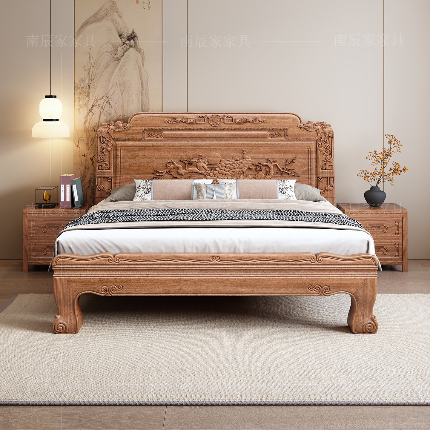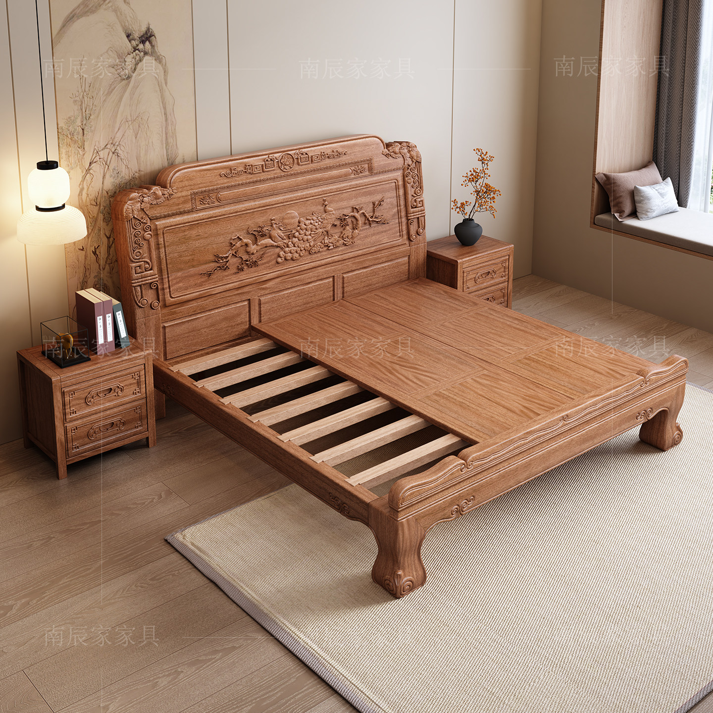 红檀木全实木新中式双人床1.8m卧室大床全原木老虎脚榫卯结构婚床