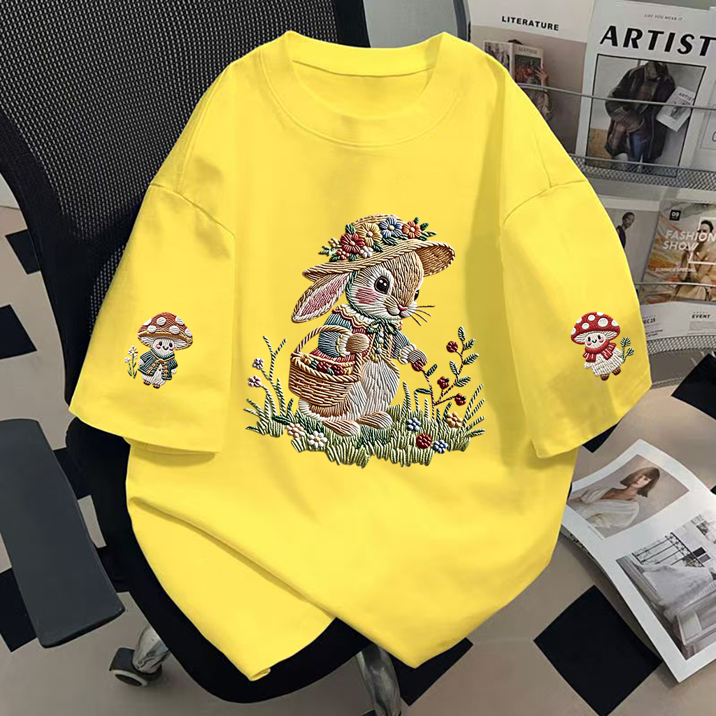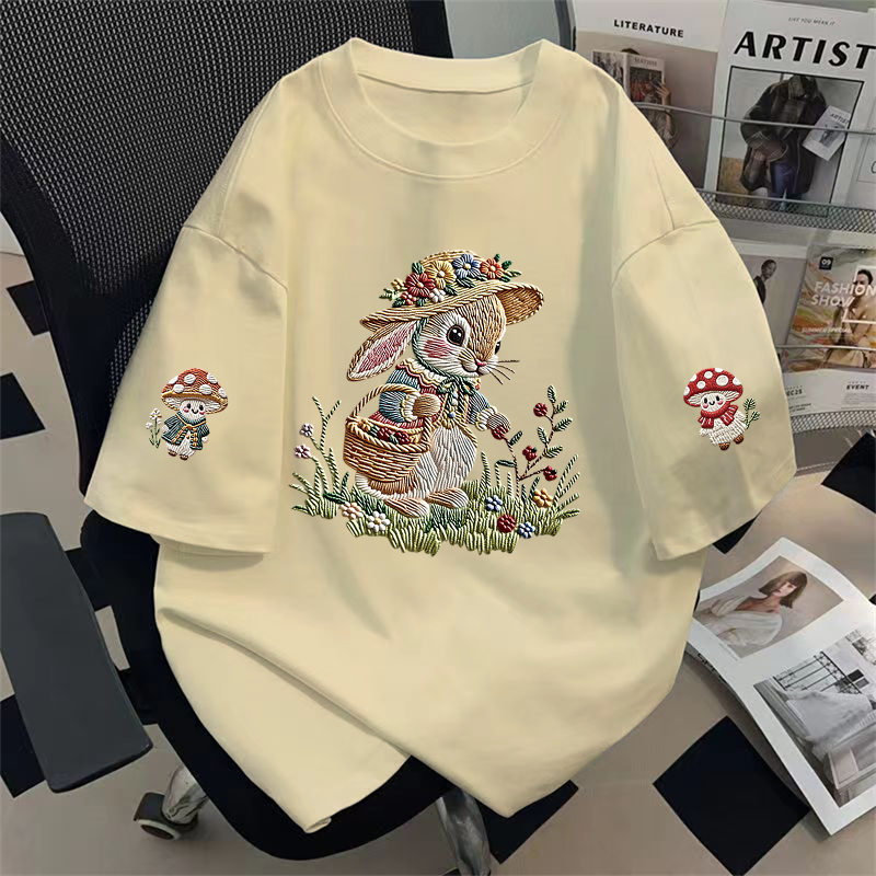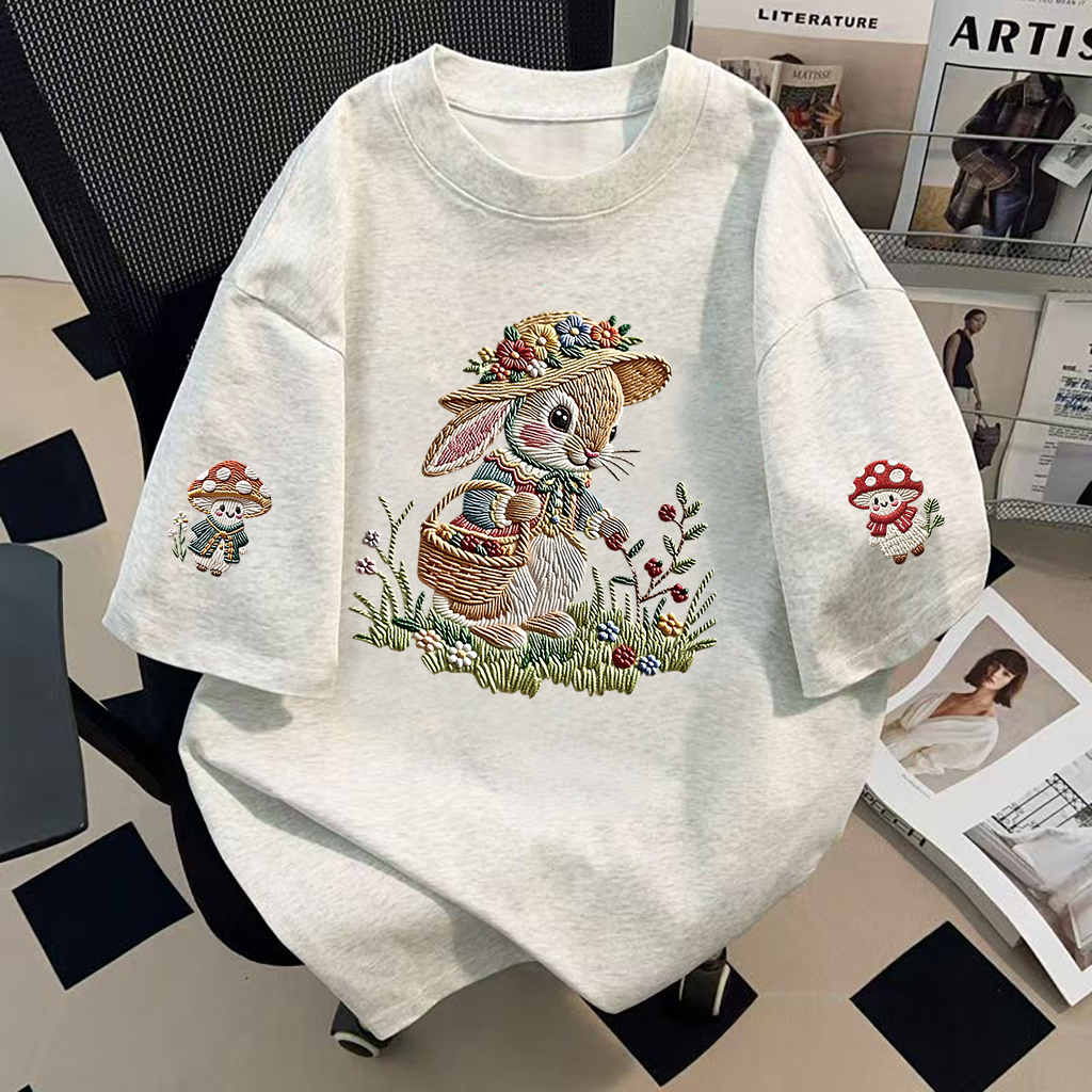 美式复古高磅纯棉仿刺绣采花兔子短袖T恤夏高级感创意印花ins上衣