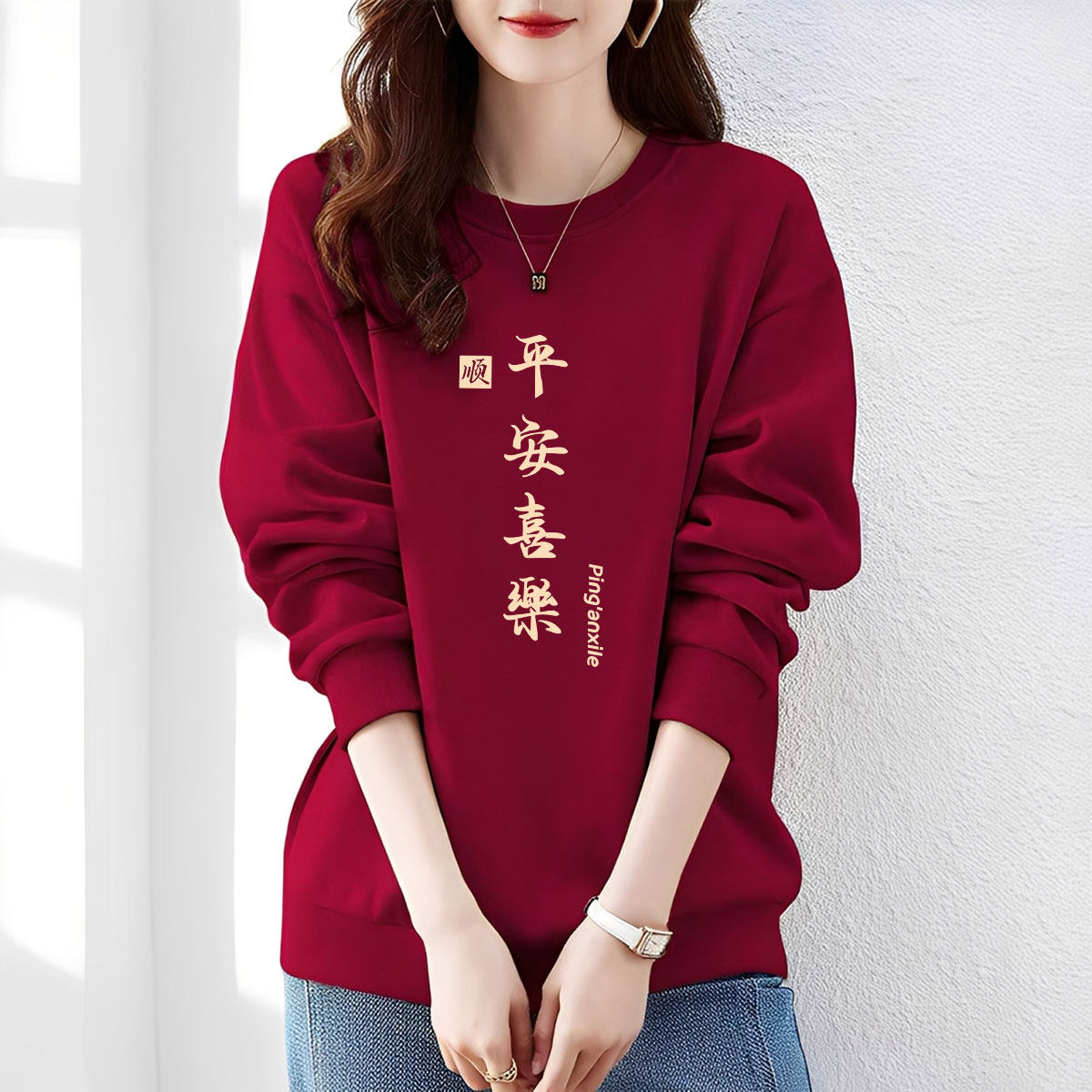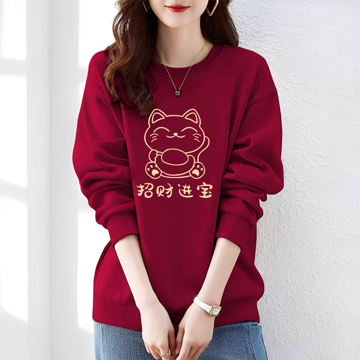 2026马年酒红色本命年圆领卫衣女加绒加厚保暖款上衣百搭宽松休闲
