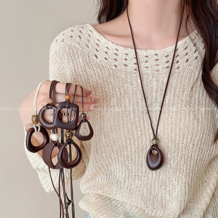 复古长款木质圆环吊坠项链女初秋新款挂脖毛衣链不规则咖色配饰品